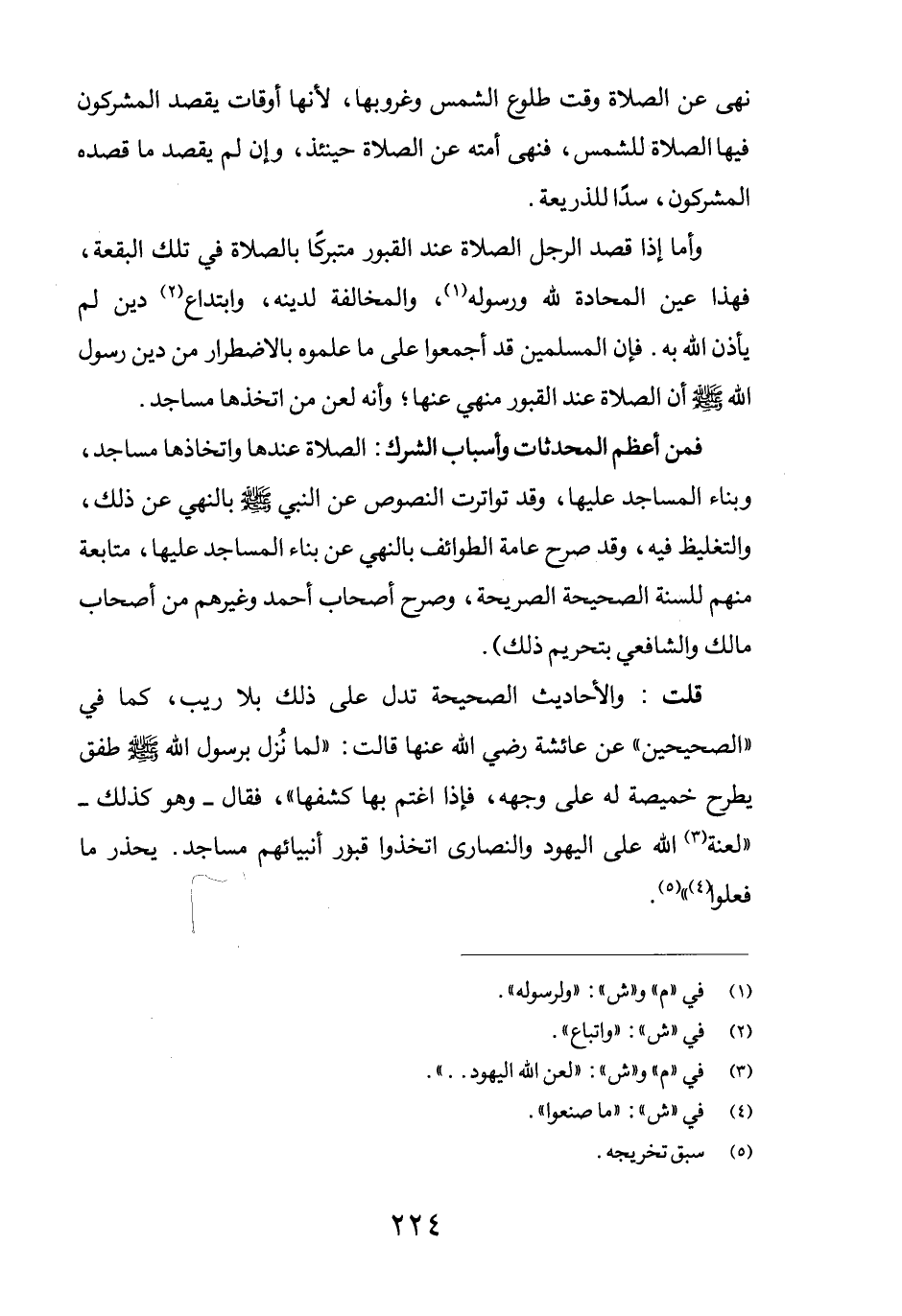 فمن أعظم المحدثات وأسباب الشرك: الصلاة عندها واتخاذها مساجد، وبناء المساجد عليها، وقد تواترت النصوص عن النبي صلى الله عليه وسلم بالنهي عن ذلك، والتغليظ فيه، وقد صرح عامة الطوائف بالنهي عن بناء المساجد عليها، متابعة منهم للسنة الصحيحة الصريحة، وصرح أصحاب أحمد وغيرهم من أصحاب مالك والشافعي بتحريم ذلك) .