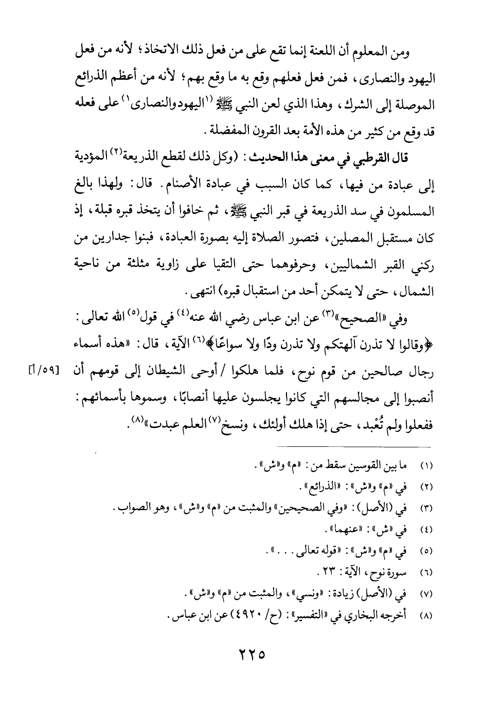 ومن المعلوم أن اللعنة إنما تقع على من فعل ذلك الاتخاذ؛ لأنه من فعل اليهود والنصارى، فمن فعل فعلهم وقع به ما وقع بهم؛ لأنه من أعظم الذرائع الموصلة إلى الشرك، وهذا الذي لعن النبي صلى الله عليه وسلم (1 اليهود والنصارى1) (1) على فعله قد وقع من كثير من هذه الأمة بعد القرون المفضلة.