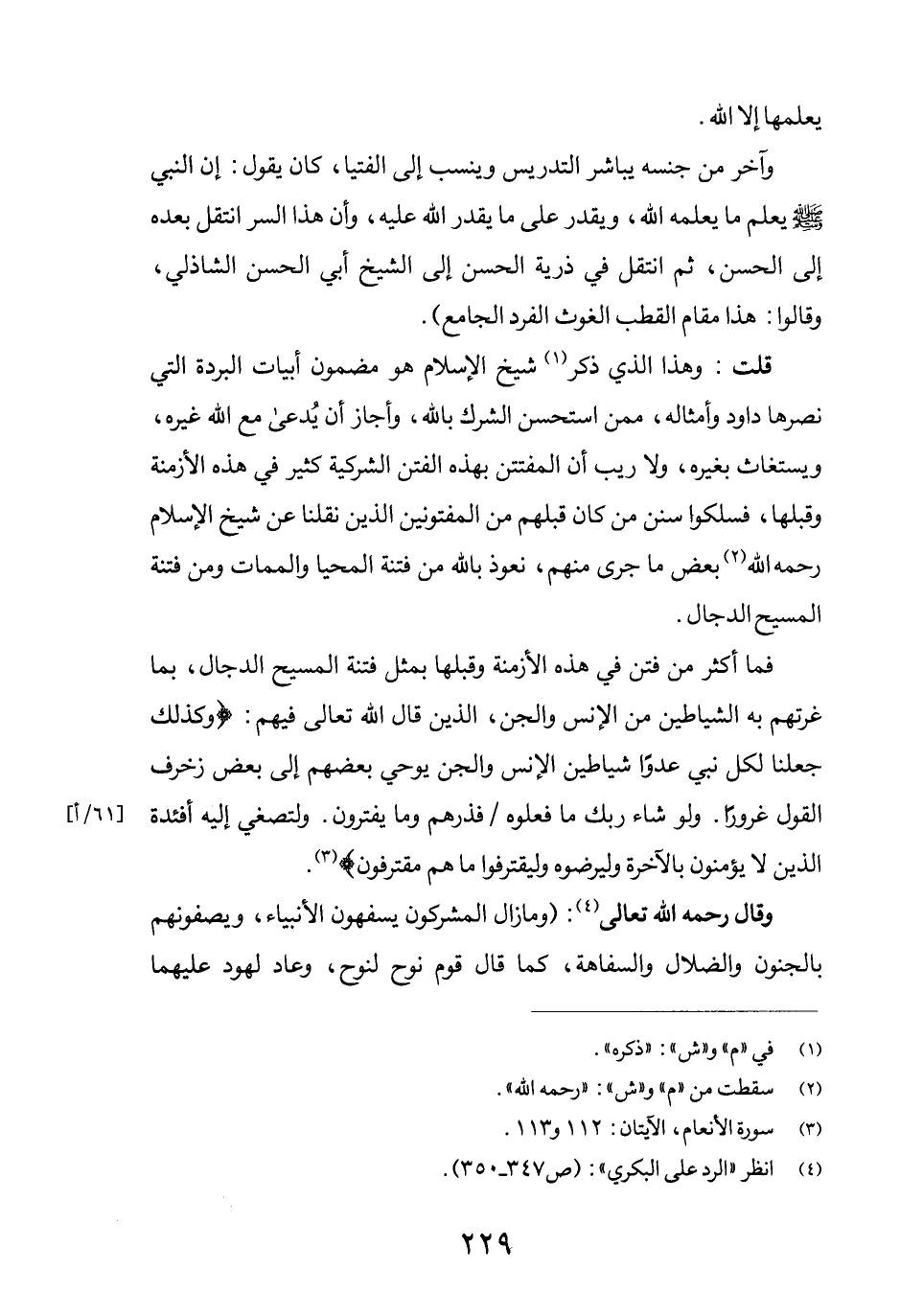 قلت: وهذا الذي ذكر (1) شيخ الإسلام هو مضمون أبيات البردة التي نصرها داود وأمثاله، ممن استحسن الشرك بالله، وأجاز أن يُدعى مع الله غيره، ويستغاث بغيره، ولا ريب أن المفتتن بهذه الفتن الشركية كثير في هذه الأزمنة وقبلها، فسلكوا سنن من كان قبلهم من المفتونين الذين نقلنا عن شيخ الإسلام رحمه الله (2) بعض ما جرى منهم، نعوذ بالله من فتنة المحيا والممات ومن فتنة المسيح الدجال.