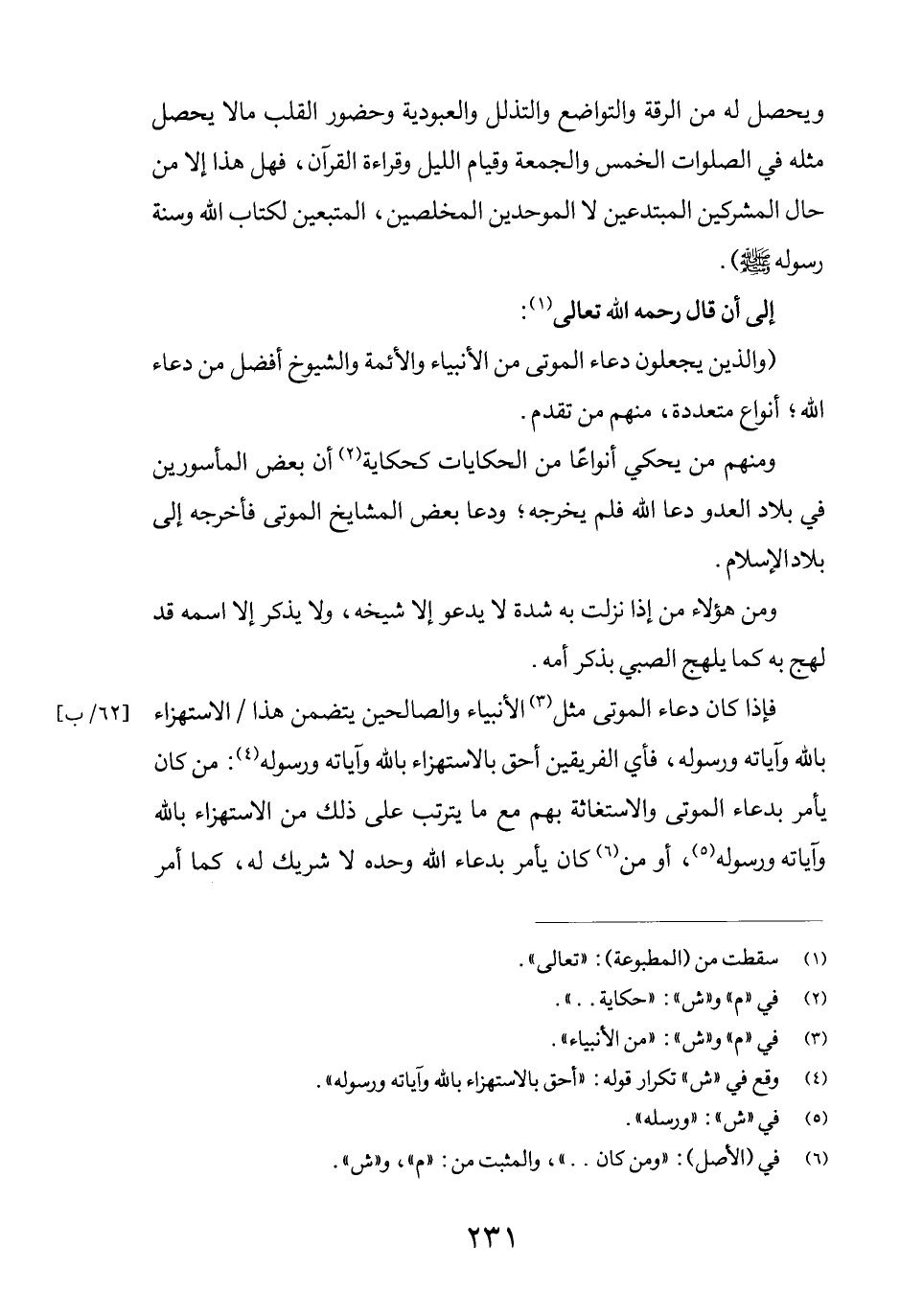 ويحصل له من الرقة والتواضع والتذلل والعبودية وحضور القلب ما لا يحصل مثله في الصلوات الخمس والجمعة وقيام الليل وقراءة القرآن، فهل هذا إلا من حال المشركين المبتدعين لا الموحدين المخلصين، المتبعين لكتاب الله وسنة رسوله صلى الله عليه وسلم) .