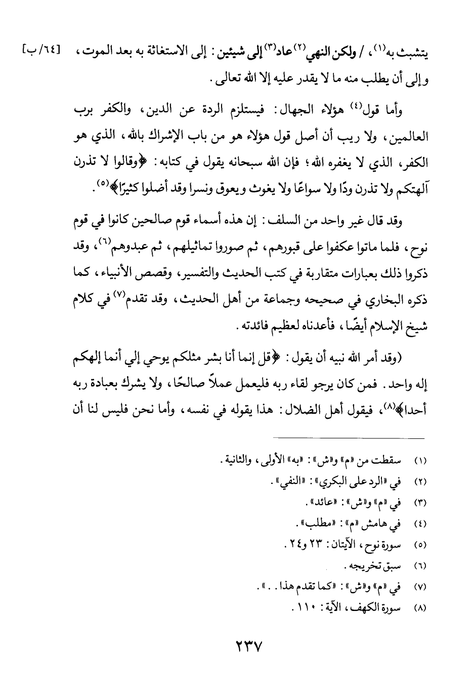 يتشبث به (1) ، / ولكن النهي (2) عاد (3) إلى شيئين: إلى الاستغاثة به بعد الموت، وإلى أن يطلب منه ما لا يقدر عليه إلا الله تعالى. وأما قول (4) هؤلاء الجهال: فيستلزم الردة عن الدين، والكفر برب العالمين، ولا ريب أن أصل قول هؤلاء هو من باب الإشراك بالله، الذي هو الكفر، الذي لا يغفره الله؛ فإن الله سبحانه يقول في كتابه: {وَقَالُوا لا تَذَرُنَّ آلِهَتَكُمْ وَلا تَذَرُنَّ وَدّاً وَلا سُوَاعاً وَلا يَغُوثَ وَيَعُوقَ وَنَسْراً. وَقَدْ أَضَلُّوا كَثِيراً} (5) .