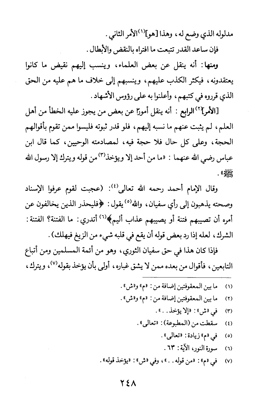 وقال الإمام أحمد رحمه الله تعالى (4) : (عجبت لقوم عرفوا الإسناد وصحته يذهبون إلى رأي سفيان، والله (5) يقول: {فَلْيَحْذَرِ الَّذِينَ يُخَالِفُونَ عَنْ أَمْرِهِ أَنْ تُصِيبَهُمْ فِتْنَةٌ أَوْ يُصِيبَهُمْ عَذَابٌ أَلِيم} (6) أتدري: ما الفتنة؟ الفتنة: الشرك، لعله إذا رد بعض قوله أن يقع في قلبه شيء من الزيغ فيهلك) .