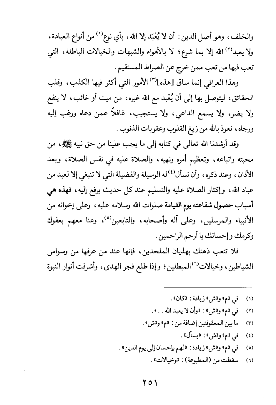 وقد أرشدنا الله تعالى في كتابه إلى ما يجب علينا من حق نبيه صلى الله عليه وسلم، من محبته واتباعه، وتعظيم أمره ونهيه، والصلاة عليه في نفس الصلاة، وبعد الأذان، وعند ذكره، وأن نسأل (4) له الوسيلة والفضيلة التي لا تنبغي إلا لعبد من عباد الله، وإكثار الصلاة عليه والتسليم عند كل حديث يرفع إليه، فهذه هي أسباب حصول شفاعته يوم القيامة صلوات الله وسلامه عليه، وعلى إخوانه من الأنبياء والمرسلين، وعلى آله وأصحابه، والتابعين (5) ، وعنا معهم بعفوك وكرمك وإحسانك يا أرحم الراحمين.