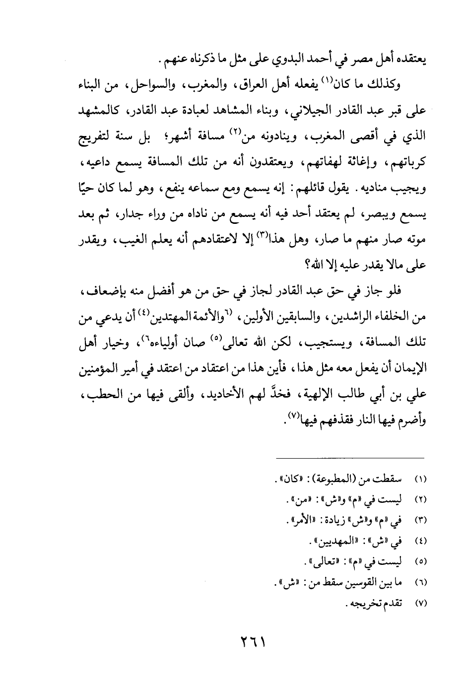 يعتقده أهل مصر في أحمد البدوي على مثل ما ذكرناه عنهم. وكذلك ما كان (1) يفعله أهل العراق، والمغرب، والسواحل، من البناء على قبر عبد القادر الجيلاني، وبناء المشاهد لعبادة عبد القادر، كالمشهد الذي في أقصى المغرب، وينادونه من (2) مسافة أشهر؛ بل سنة لتفريج كرباتهم، وإغاثة لهفاتهم، ويعتقدون أنه من تلك المسافة يسمع داعيه، ويجيب مناديه. يقول قائلهم: إنه يسمع ومع سماعه ينفع، وهو لما كان حياً يسمع ويبصر، لم يعتقد أحد فيه أنه يسمع من ناداه من وراء جدار، ثم بعد موته صار منهم ما صار، وهل هذا (3) إلا لاعتقادهم أنه يعلم الغيب، ويقدر على ما لا يقدر عليه إلا الله؟ فلو جاز في حق عبد القادر لجاز في حق من هو أفضل منه بإضعاف، من الخلفاء الراشدين، والسابقين والأولين، (6 والأئمة المهتدين (4) أن يدعي من تلك المسافة، ويستجيب، لكن الله تعالى (5) صان أولياءه6) (6) ، وخيار أهل الإيمان أن يفعل معه مثل هذا، فأين هذا من اعتقاد من اعتقد في أمير المؤمنين علي بن أبي طالب الإلهية، فخدَّ لهم الأخاديد، وألقى فيها من الحطب، وأضرم فيها النار فقذفهم فيها (7) .