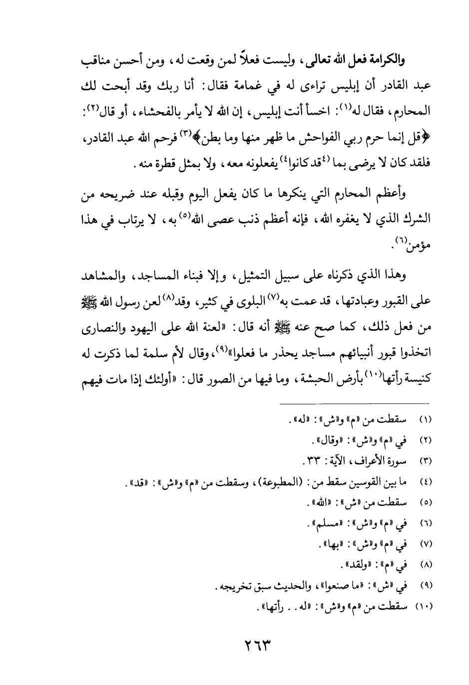 والكرامة فعل الله تعالى، وليست فعلاً لمن وقعت له، ومن أحين مناقب عبد القادر أن إبليس تراءى له في غمامة فقال: أنا ربك وقد أبحت لك المحارم، فقال له (1) : اخسأ أنت إبليس، إن الله لا يأمر بالفحشاء، أو قال (2) : {قُلْ إِنَّمَا حَرَّمَ رَبِّيَ الْفَوَاحِشَ مَا ظَهَرَ مِنْهَا وَمَا بَطَن} (3) فرحم الله عبد القادر، فلقد كان لا يرضى بما (4 قد كانوا 4) (4) يفعلونه معه، ولا بمثل قطرة منه.