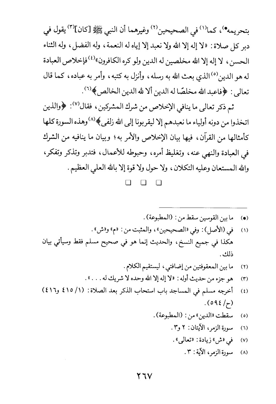 بتحريمه*) (1) كما (2) في الصحيحين وغيرهما أن النبي صلى الله عليه وسلم [كان] (3) يقول في دبر كل صلاة: "لا إله إلا الله ولا نعبد إلا إياه له النعمة، وله الفضل، وله الثناء الحسن، لا إله إلا الله مخلصين له الدين ولو كره الكافرون" (4) فإخلاص العبادة له هو الدين (5) الذي بعث الله به رسله، وأنزل به كتبه، وأمر به عباده، كما قال تعالى: {فَاعْبُدِ اللَّهَ مُخْلِصاً لَهُ الدِّينَ. أَلا لِلَّهِ الدِّينُ الْخَالِصُ} (6) .