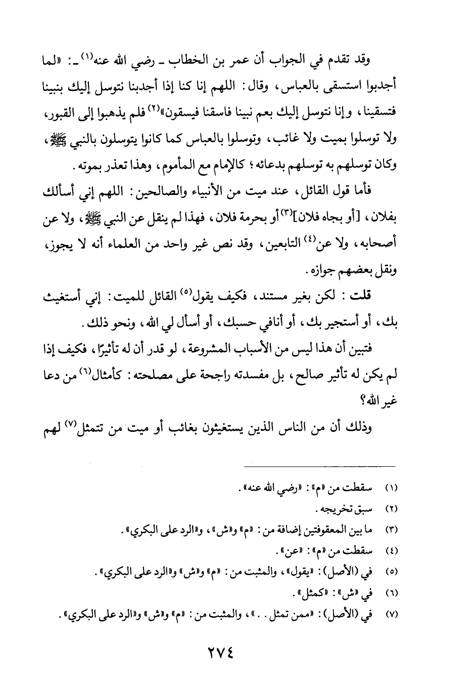 قلت: لكن بغير مستند، فكيف يقول (5) القائل للميت: إني أستغيث بك، أو أستجير بك، أو أنا في حسبك، أو أسأل لي الله، ونحو ذلك.
