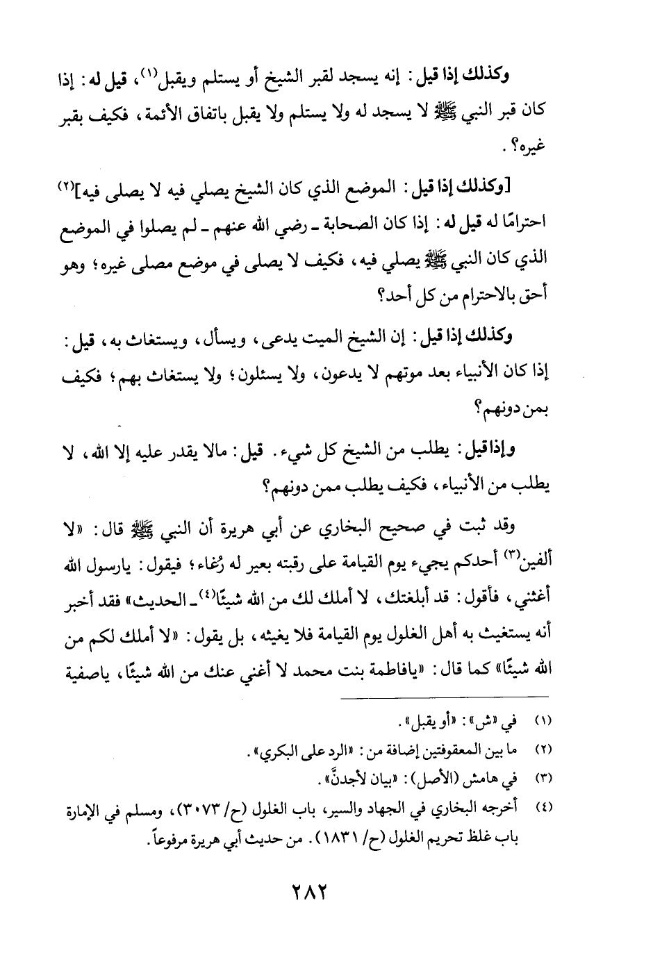 [وكذلك إذا قيل: الموضع الذي كان الشيخ يصلي فيه لا يصلى فيه] (2) احتراماً له قيل له: إذا كان الصحابة –رضي الله عنهم-لم يصلوا في الموضع الذي كان النبي صلى الله عليه وسلم يصلي فيه، فكيف لا يصلى في موضع مصلى غيره؛ وهو أحق بالاحترام من كل أحد؟ وكذلك إذا قيل: إن الشيخ الميت يدعى، ويسأل، ويستغاث به، قيل: إذا كان الأنبياء بعد موتهم لا يدعون، ولا يسئلون؛ ولا يستغاث بهم؛ فكيف بمن دونهم؟ وإذا قيل: يطلب من الشيخ كل شيء. قيل: ما لا يقدر عليه إلا الله، لا يطلب من الأنبياء، فكيف يطلب ممن دونهم؟