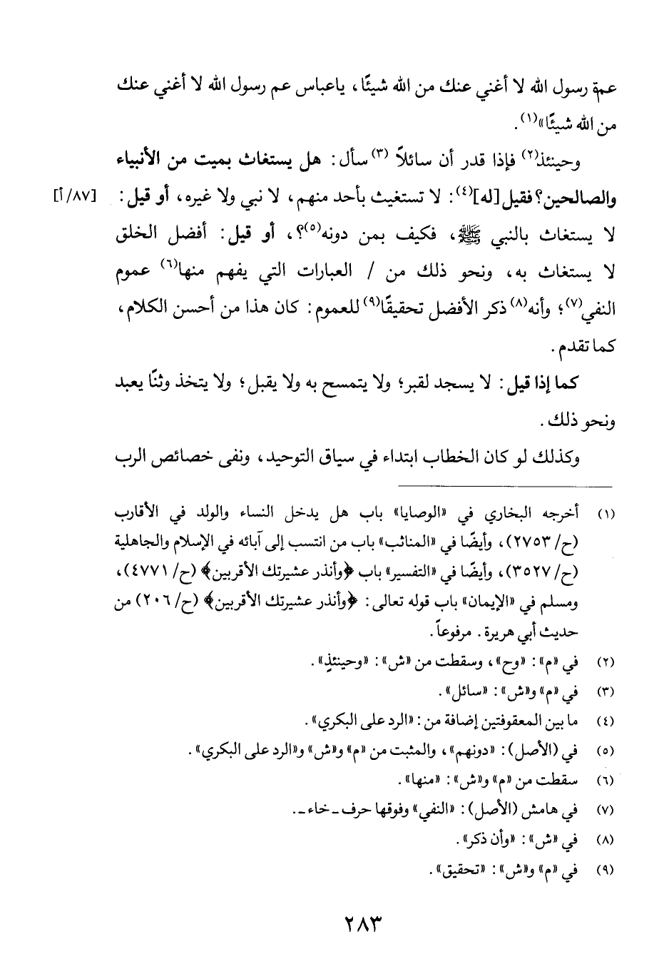 وحينئذ (2) فإذا قدر أن سائلاً (3) سأل: هل يستغاث بميت من الأنبياء والصالحين؟ فقيل [له] (4) : لا تستغيث بأحد منهم، لا نبي ولا غيره، أو قيل: لا يستغاث بالنبي صلى الله عليه وسلم، فكيف بمن دونه (5) ؟، أو قيل: أفضل الخلق لا يستغاث به، ونحو ذلك من/ العبارات التي يفهم منها (6) عموم النفي (7) ؛ وأنه (8) ذكر الأفضل تحقيقاً (9) للعموم: كان هذا من أحسن الكلام، كما تقدم.