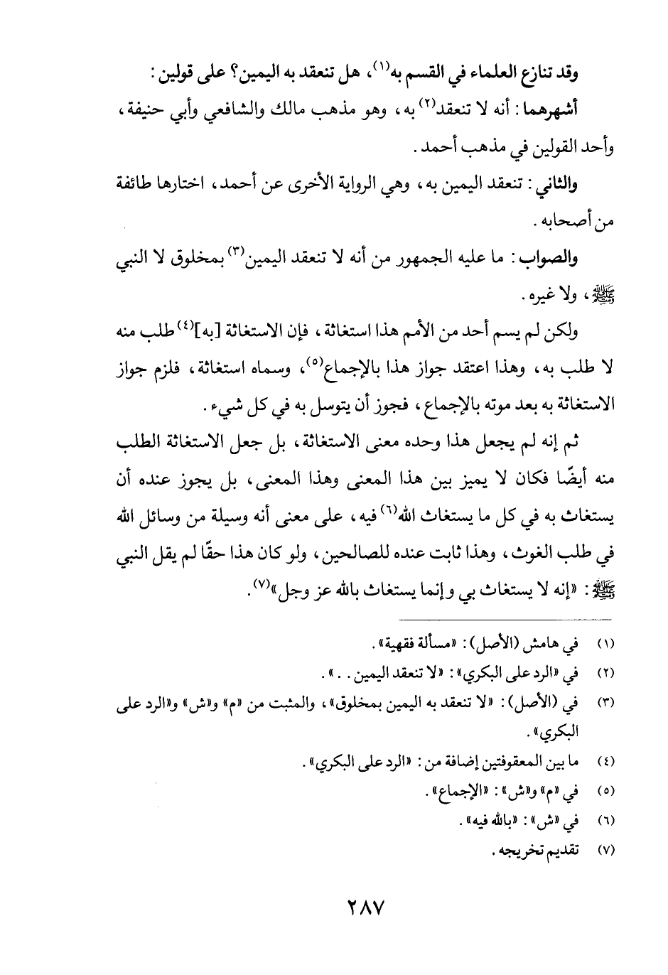 والصواب، ما عليه الجمهور من أنه لا تنعقد اليمين (3) بمخلوق لا النبي صلى الله عليه وسلم، ولا غيره. ولكن لم يسم أحد من الأمم هذا استغاثة، فإن الاستغاثة [به] (4) طلب منه لا طلب به، وهذا اعتقد جواز هذا بالإجماع (5) ، وسماه استغاثة، فلزم جواز الاستغاثة به بعد موته بالإجماع، فجوز أن يتوسل به في كل شيء. ثم إنه لم يجعل هذا وحده معنى الاستغاثة، بل جعل الاستغاثة الطلب منه أيضاً فكان لا يميز بين هذا المعنى وهذا المعنى، بل يجوز عنده أن يستغاث به في كل ما يستغاث الله (6) فيه، على معنى أنه وسيلة من وسائل الله في طلب الغوث، وهذا ثابت عنده للصالحين، ولو كان هذا حقاً لم يقل النبي صلى الله عليه وسلم: "إنه لا يستغاث بي وإنما يستغاث بالله عز وجل" (7)