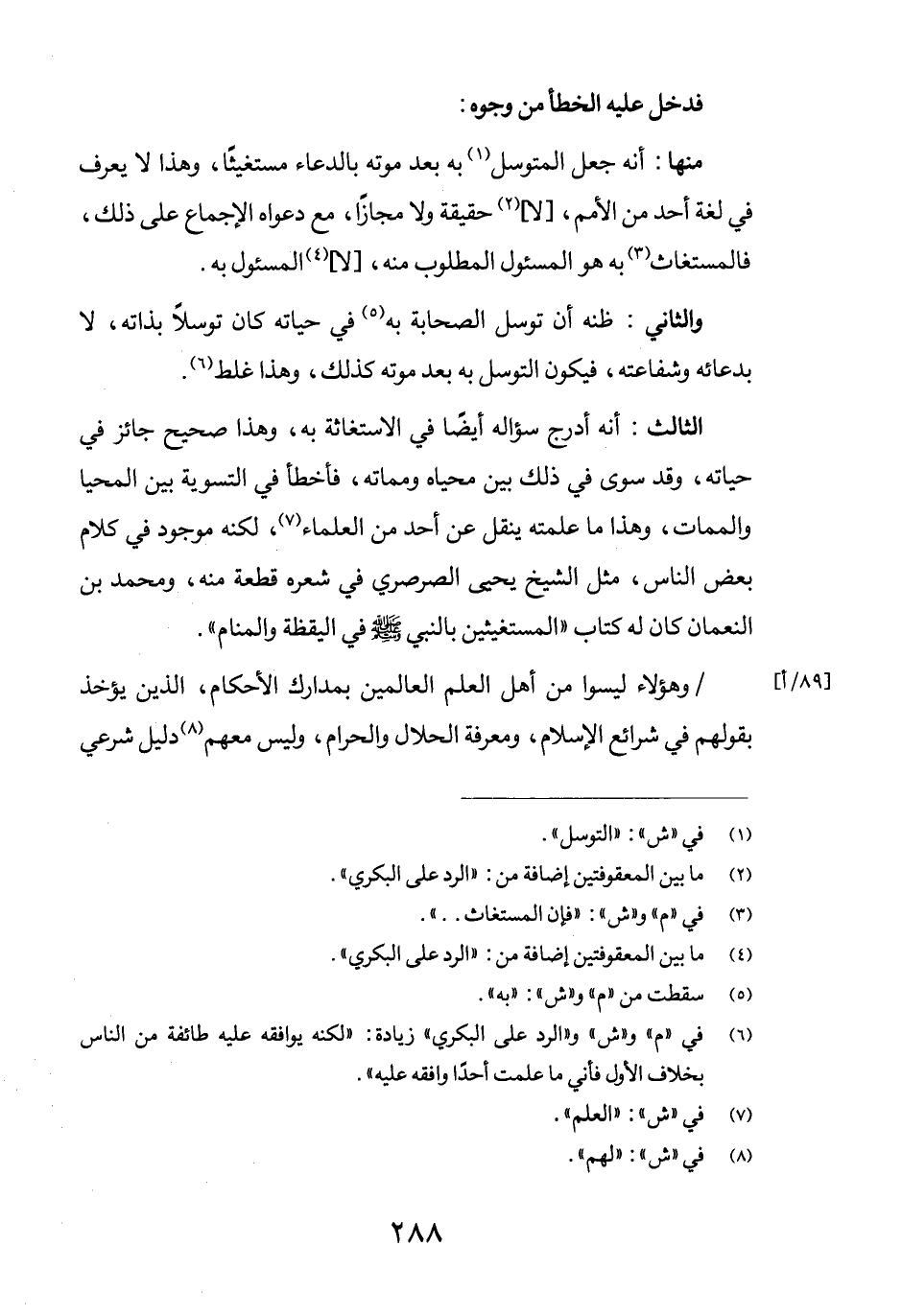 الثالث: أنه أدرج سؤاله أيضاً في الاستغاثة به، وهذا صحيح جائز في حياته، وقد سوى في ذلك بين محياه ومماته، فأخطأ في التسوية بين المحيا والممات، وهذا ما علمته ينقل عن أحد من العلماء (7) ، لكنه موجود في كلام بعض الناس، مثل الشيخ يحيى الصرصري في شعره قطعة منه، ومحمد بن النعمان كان له كتاب "المستغيثين بالنبي صلى الله عليه وسلم في اليقظة والمنام".