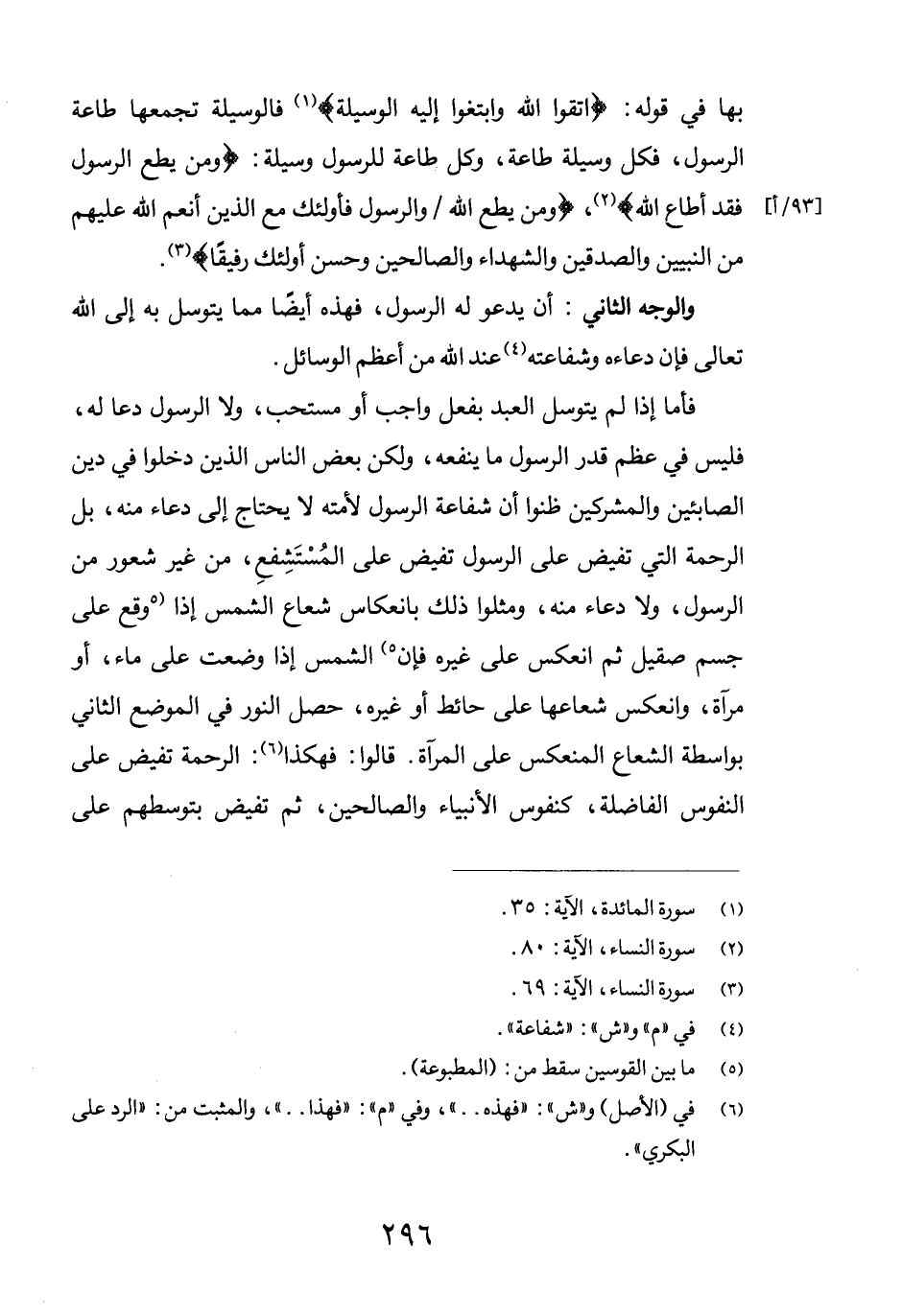 فأما إذا لم يتوسل العبد بفعل واجب أو مستحب، ولا الرسول دعا له، فليس في عظم قدر الرسول ما ينفعه، ولكن بعض الناس الذين دخلوا في دين الصابئين والمشركين ظنوا أن شفاعة الرسول لأمته لا يحتاج إلى دعاء منه، بل الرحمة التي تفيض على الرسول تفيض على المُسْتَشِفعِ، من غير شعور من الرسول، ولا دعاء منه، ومثلوا ذلك بانعكاس شعاع الشمس إذا (5 وقع على جسم صقيل ثم انعكس على غيره فإن5) (5) الشمس إذا وضعت على ماء، أو مرآة، وانعكس شعاعها على حائط أو غيره، حصل النور في الموضع الثاني بواسطة الشعاع المنعكس على المرآة. قالوا: فهكذا (6) : الرحمة تفيض على النفوس الفاضلة، كنفوس الأنبياء والصالحين، ثم تفيض بتوسطهم على