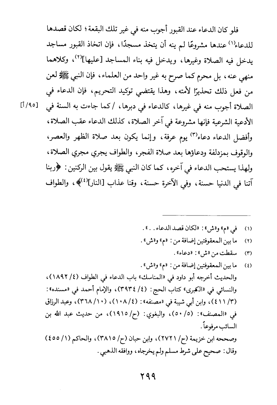 فلو كان الدعاء عند القبور أجوب منه في غير تلك البقعة؛ لكان قصدها للدعاء (1) عندها مشروعاً لم ينه أن يتخذ مسجداً، فإن اتخاذ القبور مساجد يدخل فيه الصلاة وغيرها، ويدخل فيه بناء المساجد [عليها] (2) ، وكلاهما منهي عنه، بل محرم كما صرح به غير واحد من العلماء، فإن النبي صلى الله عليه وسلم لعن من فعل ذلك تحذيراً، وهذا يقتضي توكيد التحريم، فإن الدعاء في الصلاة أجوب منه في غيرها، كالدعاء في دبرها، / كما جاءت به السنة في الأدعية الشرعية فإنها مشروعة في آخر الصلاة، كذلك الدعاء عقب الصلاة، وأفضل الدعاء دعاء (3) يوم عرفة، وإنما يكون بعد صلاة الظهر والعصر، والوقوف بمزدلفة ودعاؤها بعد صلاة الفجر، والطواف يجري مجري الصلاة، ولهذا يستحب الدعاء في آخره، كما كان النبي صلى الله عليه وسلم يقول بين الركنين {رَبَّنَا آتِنَا فِي الدُّنْيَا حَسَنَةً وَفِي الْآخِرَةِ حَسَنَةً وَقِنَا عَذَابَ [النَّارِ] } (4) ، والطواف