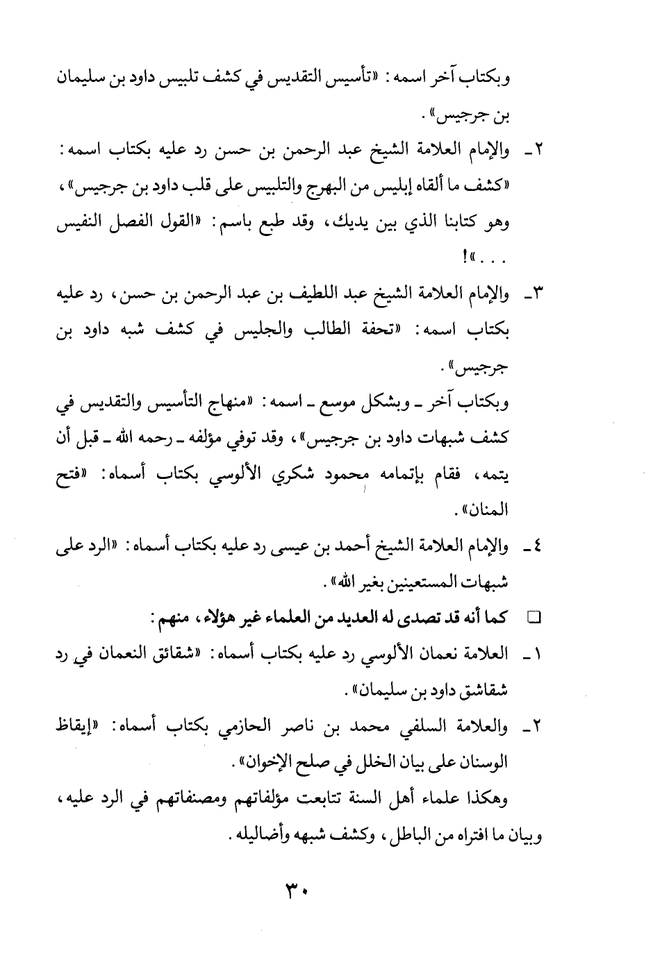 2- والإمام العلامة الشيخ عبد الرحمن بن حسن رد عليه بكتاب اسمه: "كشف ما ألقاه إبليس من البهرج والتلبيس على قلب داود بن جرجيس"، وهو كتابنا الذي بين يديك، وقد طبع باسم: "القول الفصل النفيس