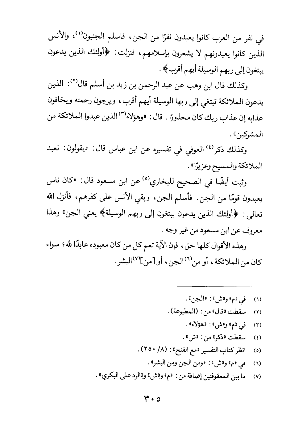 وثبت أيضاً في الصحيح للبخاري (5) عن ابن مسعود قال: "كان ناس يعبدون قوماً من الجن. فأسلم الجن، وبقي الأنس على كفرهم، فأنزل الله تعالى: {أُولَئِكَ الَّذِينَ يَدْعُونَ يَبْتَغُونَ إِلَى رَبِّهِمُ الْوَسِيلَةَ} يعني الجن" وهذا