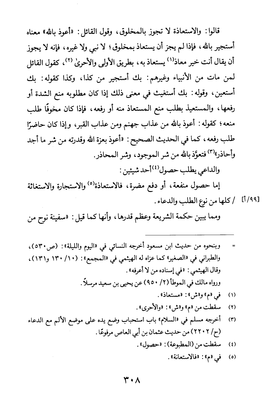 قالوا: والاستعاذة لا تجوز بالمخلوق، وقول القائل: "أعوذ بالله" معناه أستجير بالله، فإذا لم يجز أن يستعاذ بمخلوق؛ لا نبي ولا غيره، فإنه لا يجوز أن يقال أنت خير معاذ (1) يستعاذ به، بطريق الأولى والأحرى (2) ، كقول القائل لمن مات من الأنبياء وغيرهم: بك استجير من كذا، وكذا كقوله: بك أستعين، وقوله: بك أستغيث في معنى ذلك إذا كان مطلوبه منع الشدة أو رفعها، والمستعيذ بطلب منع المستعاذ منه أو رفعه، فإذا كان مخوفاً طلب منعه؛ كقوله: أعوذ بالله من عذاب جهنم ومن عذاب القبر، وإذا كان حاضراً طلب رفعه، كما في الحديث الصحيح: "أعوذ بعزة الله وقدرته من شر ما أجد وأحاذر" (3) فتعوَّذ من شر الموجود، وشر المحاذر.