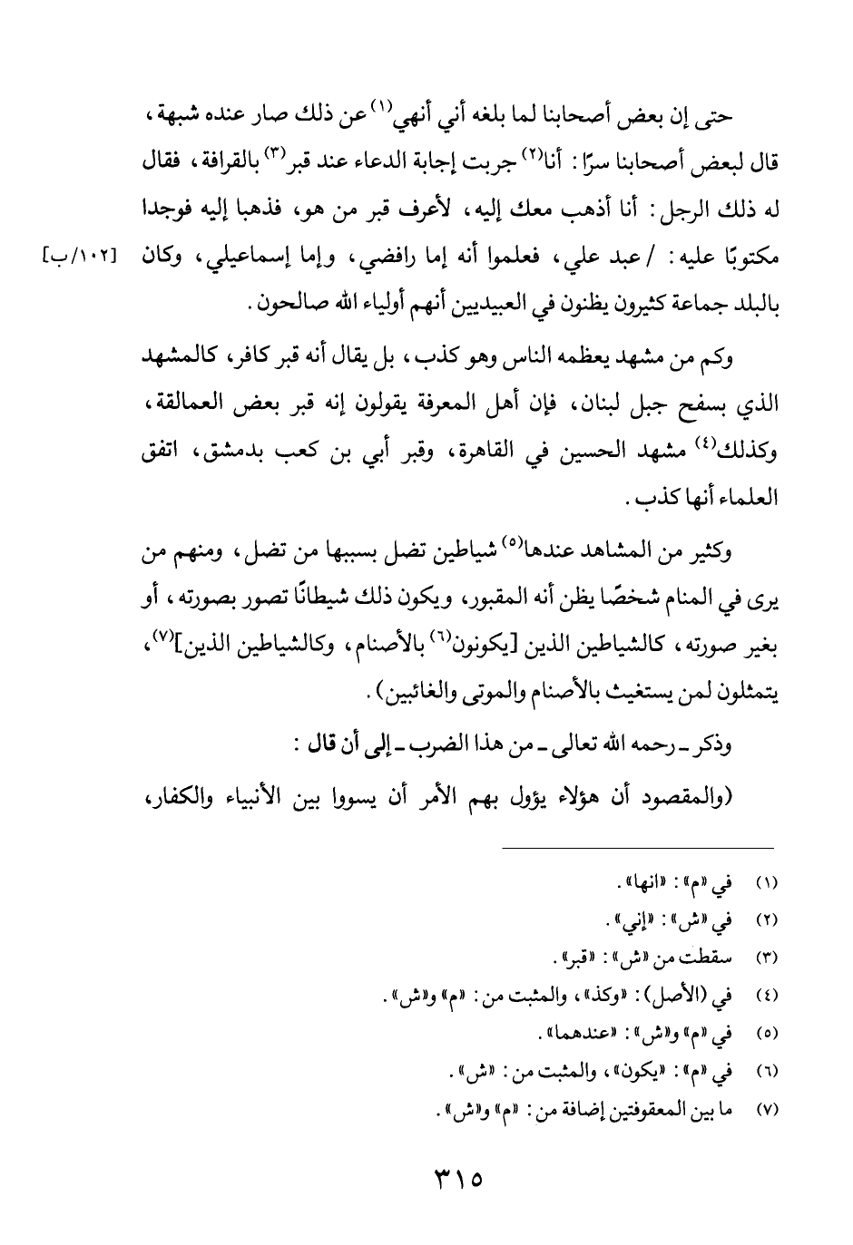 وكثير من المشاهد عندها (5) شياطين تضل بسببها من تضل، ومنهم من يرى في المنام شخصاً يظن أنه المقبور، ويكون ذلك شيطاناً تصور بصورته، أو بغير صورته، كالشياطين الذين [يكونون (6) بالأصنام، وكالشياطين الذين] (7) ، يتمثلون لمن يستغيث بالأصنام والموتى والغائبين) .