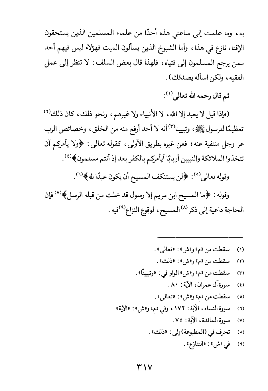 (فإذا قيل لا يعبد إلا الله، لا الأنبياء ولا غيرهم، ونحو ذلك، كان ذلك (2) تعظيماً للرسول صلى الله عليه وسلم، وتبيينا (3) أنه لا أحد أرفع منه من الخلق، وخصائص الرب عز وجل منتفية عنه؛ فعن غيره بطريق الأولى، كقوله تعالى: {وَلا يَأْمُرَكُمْ أَنْ تَتَّخِذُوا الْمَلائِكَةَ وَالنَّبِيِّينَ أَرْبَاباً أَيَأْمُرُكُمْ بِالْكُفْرِ بَعْدَ إِذْ أَنْتُمْ مُسْلِمُون} (4) . وقوله تعالى (5) : {لَنْ يَسْتَنْكِفَ الْمَسِيحُ أَنْ يَكُونَ عَبْداً لِلَّه} (6) . وقوله: {مَا الْمَسِيحُ ابْنُ مَرْيَمَ إِلَّا رَسُولٌ قَدْ خَلَتْ مِنْ قَبْلِهِ الرُّسُل} (7) فإن الحاجة داعية إلى ذكر (8) المسيح، لوقوع النزاع (9) فيه.