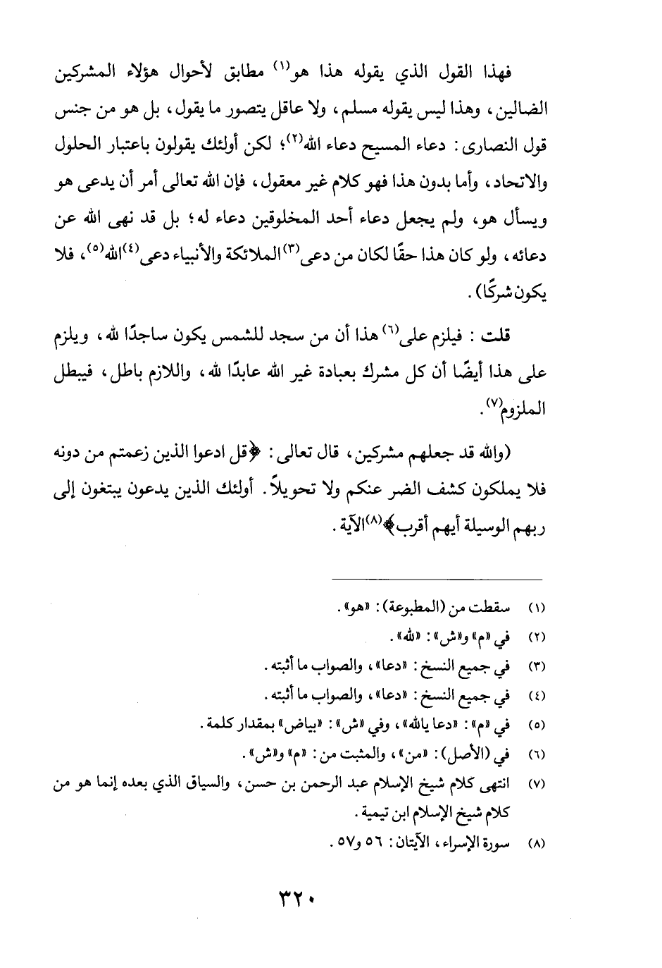 (7) انتهى كلام شيخ الإسلام عبد الرحمن بن حسن، والسياق الذي بعده إنما هو من كلام شيخ الإسلام ابن تيمية.