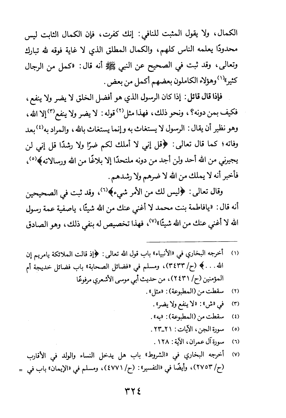 الكمال، ولا يقول المثبت للنافي: إنك كفرت، فإن الكمال الثابت ليس محدوداً يعلمه الناس كلهم، والكمال المطلق الذي لا غاية فوقه لله تبارك وتعالى، وقد ثبت في الصحيح عن النبي صلى الله عليه وسلم أن قال: "كمل من الرجال كثير" (1) وهؤلاء الكاملون بعضهم أكمل من بعض.