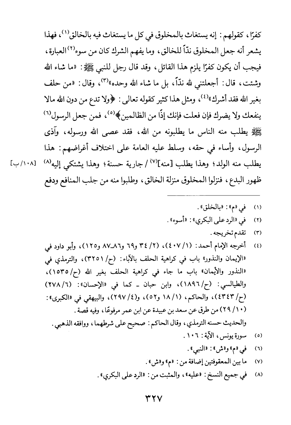 كفراً، كقولهم: إنه يستغاث بالمخلوق في كل ما يستغاث فيه بالخالق (1) ، فهذا يشعر أنه جعل المخلوق ندّاً للخالق، وما يفهم الشرك كان من سوء (2) العبارة، فيجب أن يكون كفراً يلزم هذا القائل، وقد قال رجل للنبي صلى الله عليه وسلم: "ما شاء الله وشئت، قال: "أجعلتني لله ندّاً، بل ما شاء الله وحده" (3) ، وقال: "من حلف بغير الله فقد أشرك" (4) ، ومثل هذا كثير كقوله تعالى: {وَلا تَدْعُ مِنْ دُونِ اللَّهِ مَا لا يَنْفَعُكَ وَلا يَضُرُّكَ فَإِنْ فَعَلْتَ فَإِنَّكَ إِذاً مِنَ الظَّالِمِينَ} (5) ، فمن جعل الرسول (6) صلى الله عليه وسلم يطلب منه الناس ما يطلبونه من الله، فقد عصى الله ورسوله، وآذى الرسول، وأساء في حقه، وسلط عليه العامة على اختلاف أغراضهم: هذا يطلب منه الولد؛ وهذا يطلب [منه] (7) / جارية حسنة؛ وهذا يشتكي إليه (8) ظهور البدع، فنزلوا المخلوق منزلة الخالق، وطلبوا منه من جلب المنافع ودفع