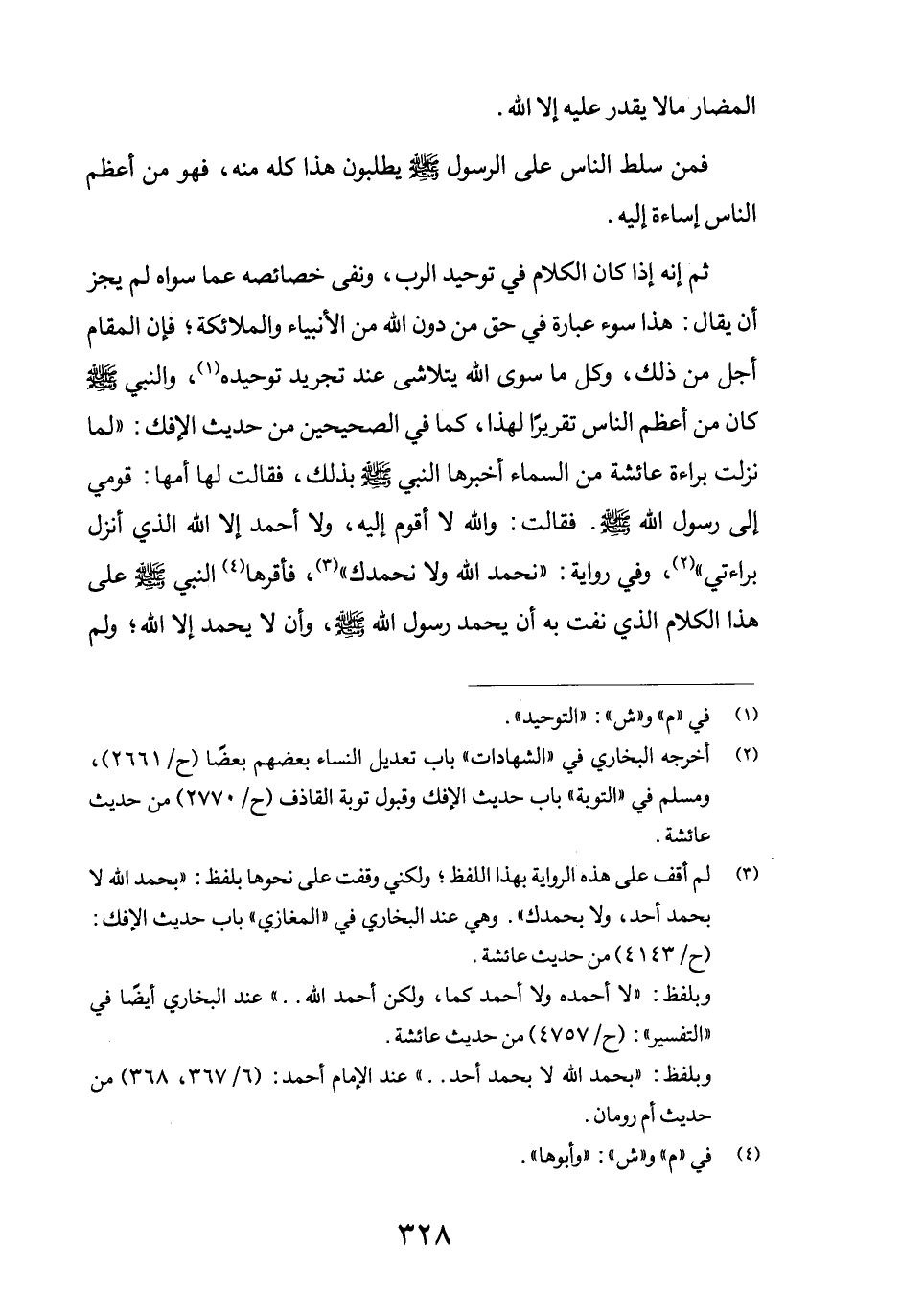 ثم إنه إذا كان الكلام في توحيد الرب، ونفى خصائصه عما سواه لم يجز أن يقال: هذا سوء عبارة في حق من دون الله من الأنبياء والملائكة؛ فإن المقام أجل من ذلك، وكل ما سوى الله يتلاشى عند تجريد توحيده (1) ، والنبي صلى الله عليه وسلم كان من أعظم الناس تقريراً لهذا، كما في الصحيحين من حديث الإفك: "لما نزلت براءة عائشة من السماء أخبرها النبي صلى الله عليه وسلم بذلك، فقالت لها أمها: قومي إلى رسول الله صلى الله عليه وسلم. فقالت: والله لا أقوم إليه، ولا أحمد إلا الله الذي أنزل براءتي" (2) ، وفي رواية: "نحمد الله ولا نحمدك" (3) ، فأقرها (4) النبي صلى الله عليه وسلم على هذا الكلام الذي نفت به أن يحمد رسول الله صلى الله عليه وسلم، وأن لا يحمد إلا الله؛ ولم