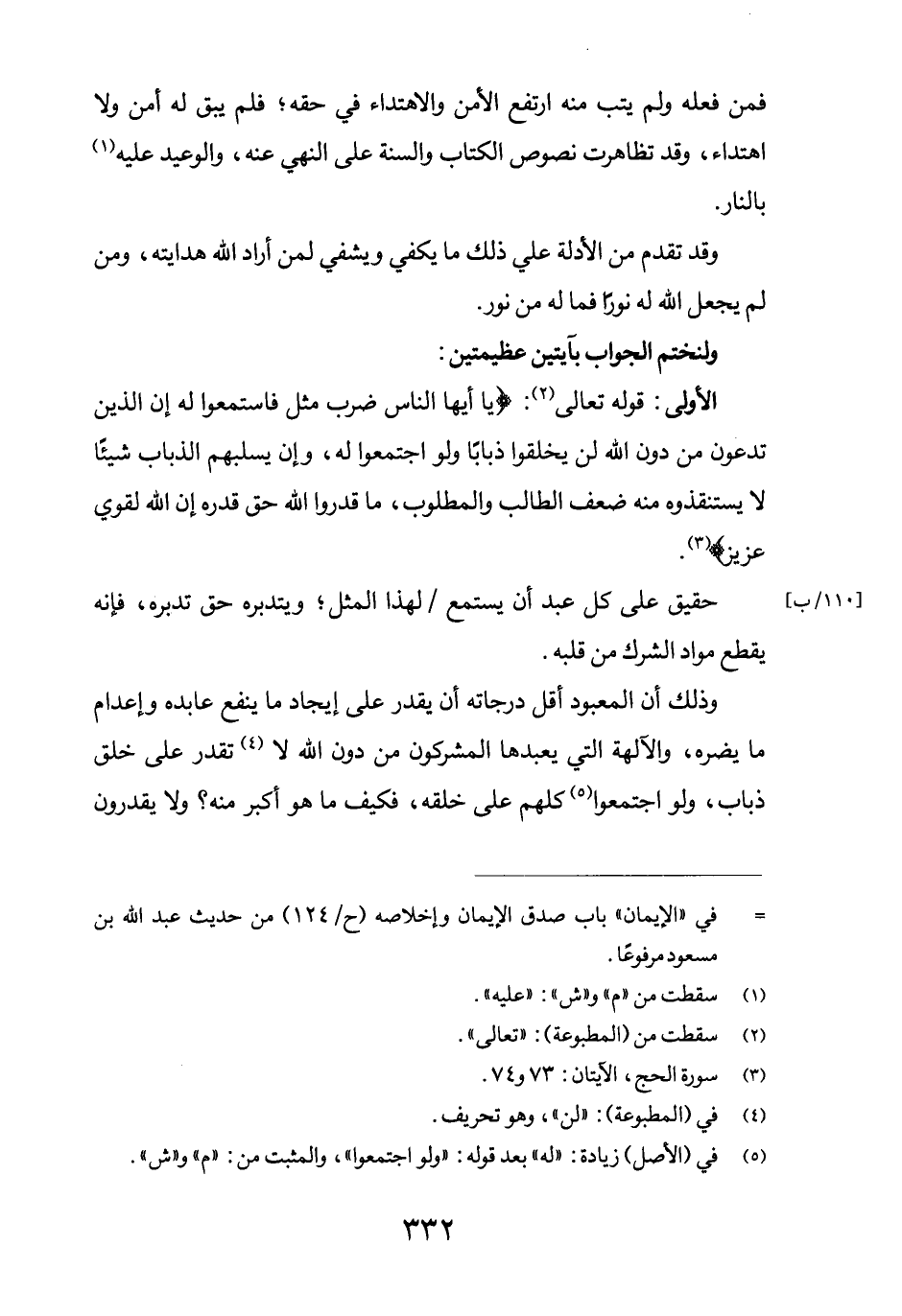 الأولى: قوله تعالى (2) : {يَا أَيُّهَا النَّاسُ ضُرِبَ مَثَلٌ فَاسْتَمِعُوا لَهُ إِنَّ الَّذِينَ تَدْعُونَ مِنْ دُونِ اللَّهِ لَنْ يَخْلُقُوا ذُبَاباً وَلَوِ اجْتَمَعُوا لَهُ وَإِنْ يَسْلُبْهُمُ الذُّبَابُ شَيْئاً لا يَسْتَنْقِذُوهُ مِنْهُ ضَعُفَ الطَّالِبُ وَالْمَطْلُوب مَا قَدَرُوا اللَّهَ حَقَّ قَدْرِهِ إِنَّ اللَّهَ لَقَوِيٌّ عَزِيز} (3) .