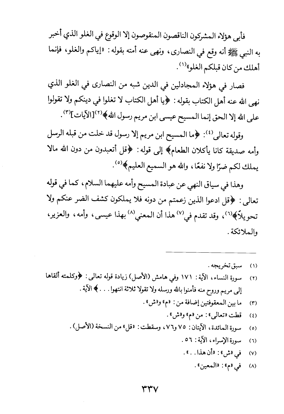 فصار في هؤلاء المجادلين في الدين شبه من النصارى في الغلو الذي نهى الله عنه أهل الكتاب بقوله: {يَا أَهْلَ الْكِتَابِ لا تَغْلُوا فِي دِينِكُمْ وَلا تَقُولُوا عَلَى اللَّهِ إِلَّا الْحَقَّ إِنَّمَا الْمَسِيحُ عِيسَى ابْنُ مَرْيَمَ رَسُولُ اللَّه} (2) [الآيات] (3) .