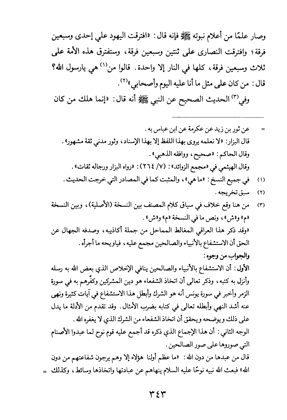 "وقد ذكر هذا العراقي المغالط المماحل من جملة أكاذيبه، وصدفه الجهال عن الحق أن الاستشفاع بالأنبياء والصالحين مجمع عليه، فيا ويحه ما أجرأه.