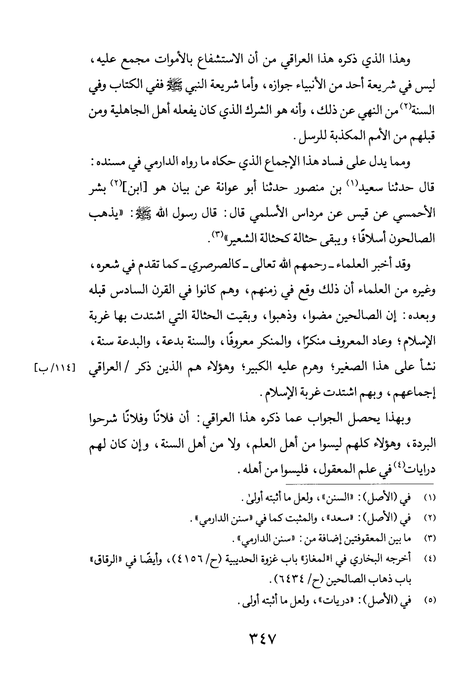 وهذا الذي ذكره هذا العراقي من أن الاستشفاع بالأموات مجمع عليه، ليس في شريعة أحد من الأنبياء جوازه، وأما شريعة النبي صلى الله عليه وسلم ففي الكتاب وفي السنة (1) من النهي عن ذلك، وأنه هو الشرك الذي كان يفعله أهل الجاهلية ومن قبلهم من الأمم المكذبة للرسل.