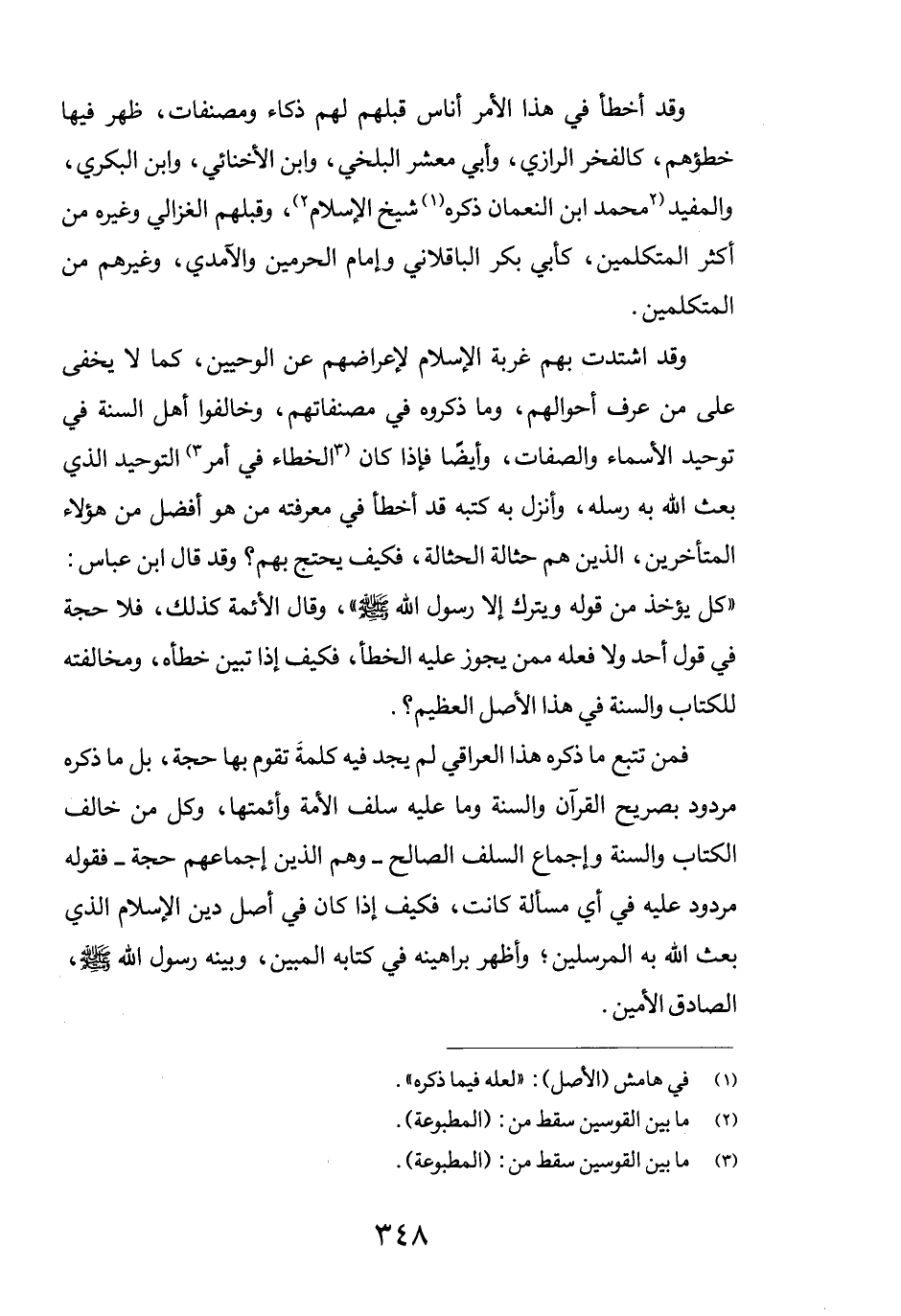 وقد أخطأ في هذا الأمر أناس لهم ذكاء ومصنفات، ظهر فيها خطؤهم، كالفخر الرازي، وأبي معشر البلخي، وابن الأخنائي، وابن البكري، والمفيد (2 محمد ابن النعمان ذكره (1) شيخ الإسلام2) (2) ، وقبلهم الغزالي وغيره من أكثر المتكلمين، كأبي بكر الباقلاني وإمام الحرمين والآمدي، وغيرهم من المتكلمين.