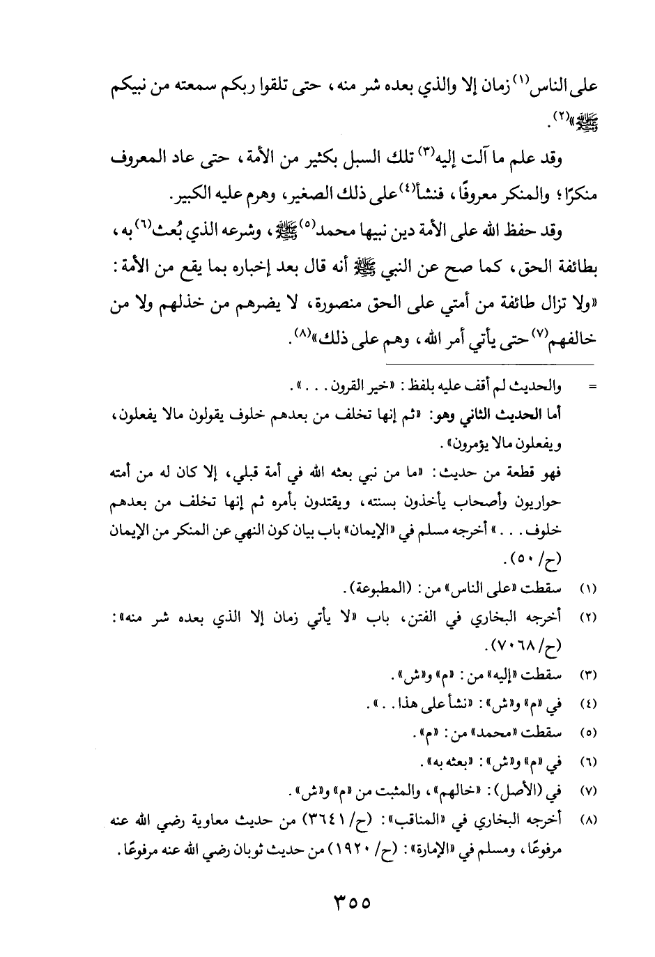 وقد حفظ الله على الأمة دين نبيها محمد (5) صلى الله عليه وسلم، وشرعه الذي بُعث (6) به، بطائفة الحق، كما صح عن النبي صلى الله عليه وسلم أنه قال بعد إخباره بما يقع من الأمة: "ولا تزال طائفة من أمتي على الحق منصورة، لا يضرهم من خذلهم ولا من خالفهم (7) حتى يأتي أمر الله، وهم على ذلك" (8) .