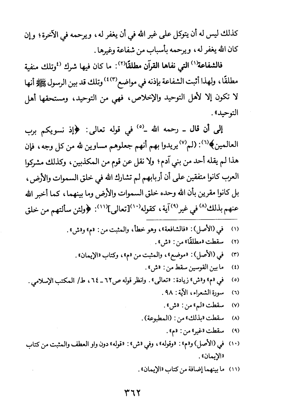 فالشفاعة (1) التي نفاها القرآن مطلقاً (2) : ما كان فيها شرك (4 وتلك منفية مطلقاً، ولهذا أثبت الشفاعة بإذنه في مواضع (3) 4) (4) وتلك قد بين الرسول صلى الله عليه وسلم أنها لا تكون إلا لأهل التوحيد والإخلاص، فهي من التوحيد، ومستحقها أهل التوحيد".