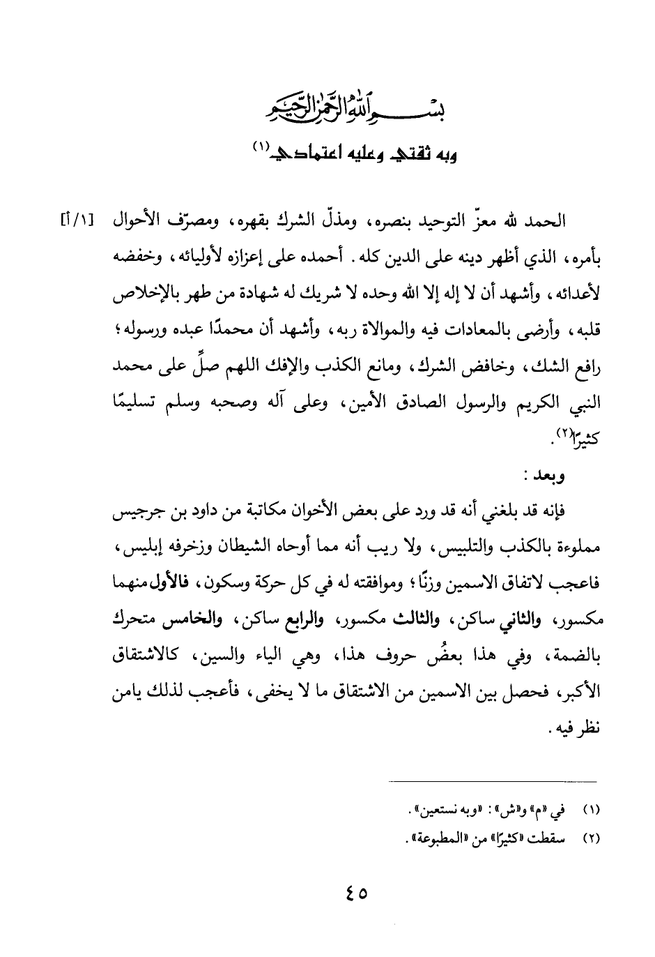 وبه ثقتي وعليه اعتمادي (1) الحمد لله معزّ التوحيد بنصره، ومذلّ الشرك بقهره، ومصرّف الأحوال بأمره، الذي أظهر دينه على الدين كله. أحمده على إعزازه لأوليائه، وخفضه لأعدائه، وأشهد أن لا إله إلا الله وحده لا شريك له شهادة من طهر بالإخلاص قلبه، وأرضى بالمعادات فيه والمولاة ربه، وأشهد أن محمداً عبده ورسوله؛ رافع الشك، وخافض الشرك، ومانع الكذب والإفك اللهم صلّ على محمدالنبي الكريم والرسول الصادق الأمين، وعلى آله وصحبه وسلم تسليماً كثيراً (2) .