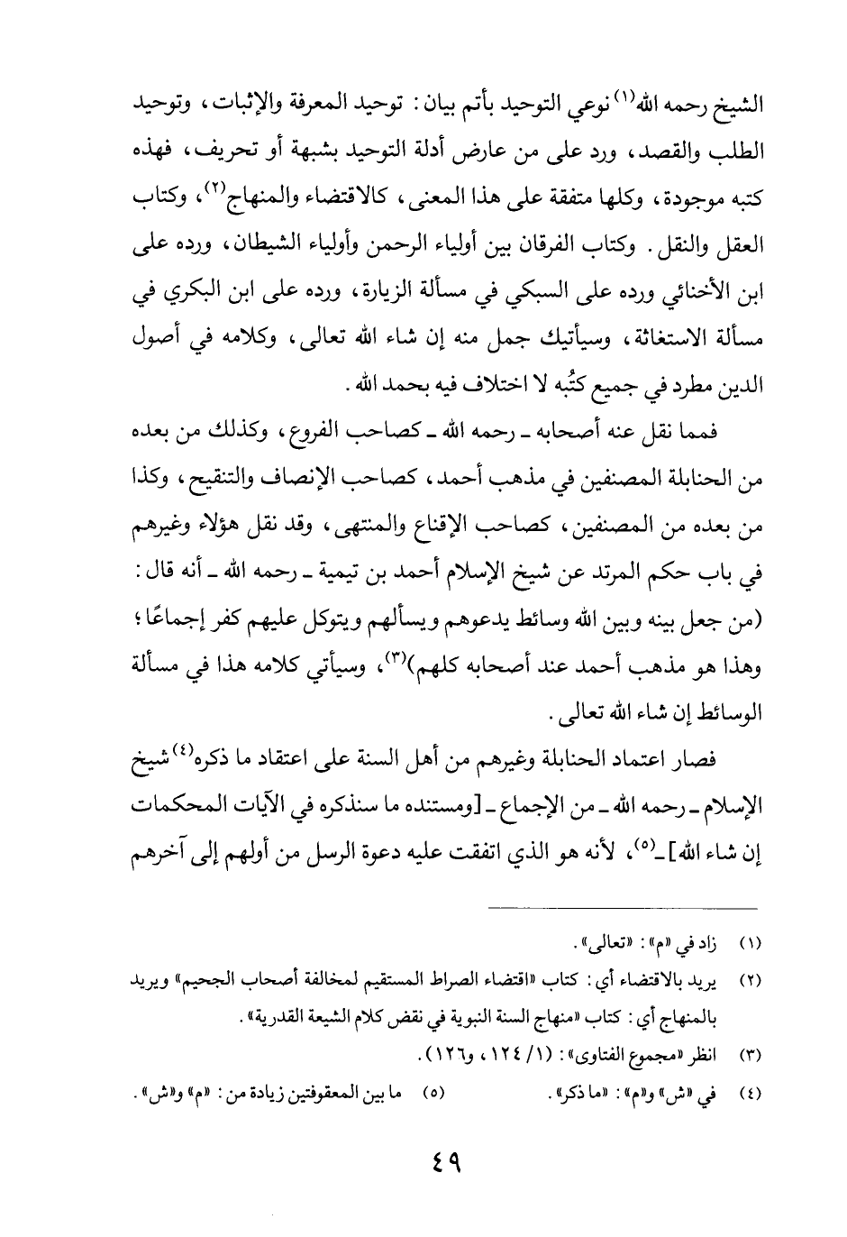 الشيخ رحمه الله (1) نوعي التوحيد بأتم بيان: توحيد المعرفة والإثبات، وتوحيد الطلب والقصد، ورد على من عارض أدلة التوحيد بشبهة أو تحريف، فهذه كتبه موجودة، وكلها متفقة على هذا المعنى، كالاقتضاء والمنهاج (2) ، وكتاب العقل النقل. وكتاب الفرقان بين أولياء الرحمن وأولياء الشيطان، ورده على ابن الأخنائي ودره على السبكي في مسألة الزيارة، ورده على ابن البكري في مسألة الاستغاثة، وسيأتيك جمل منه إن شاء الله تعالى، وكلامه في أصول الدين مطرد في جميع كتُبه لا اختلاف فيه بحمد الله. فمما نقل عنه أصحابه –رحمه الله –كصاحب الفروع، وكذلك من بعده من الحنابلة المصنفين في مذهب أحمد، كصاحب الإنصاف والتنقيح، وكذا من بعده من المصنفين، كصاحب الإقناع والمنتهى، وقد نقل هؤلاء وغيرهم في باب حكم المرتد عن شيخ الإسلام أحمد بن تيمية –رحمه الله – أنه قال: (من جعل بينه وبين الله وسائط يدعوهم ويسألهم ويتوكل عليهم كفر إجماعاً؛ وهذا هو مذهب أحمد عند أصحابه كلهم) (3) ، وسيأتي كلامه هذا في مسألة الوسائط إن شاء الله تعالى. فصار اعتماد الحنابلة وغيرهم من أهل السنة على اعتقاد ما ذكره (4) شيخ الإسلام –رحمه الله –من الإجماع – [مستنده ما ستذكره في الآيات المحكمات إن شاء الله]- (5) ، لأنه هو الذي اتفقت عليه دعوة الرسل من أولهم إلى آخرهم