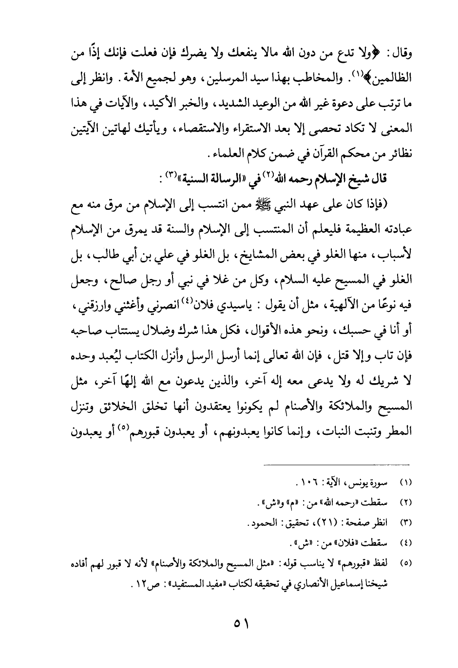 (فإذا كان على عهد النبي صلى الله عليه وسلم ممن انتسب إلى الإسلام من مرق منه مع عبادته العظيمة فليعلم أن المنتسب إلى الإسلام والسنة قد يمرق من الإسلام لأسباب، منها الغلو في بعض المشايخ، بل الغلو في علي بن أبي طالب، بل الغلو في المسيح عليه السلام، وكل من غلا في نبي أو رجل صالح، وجعل