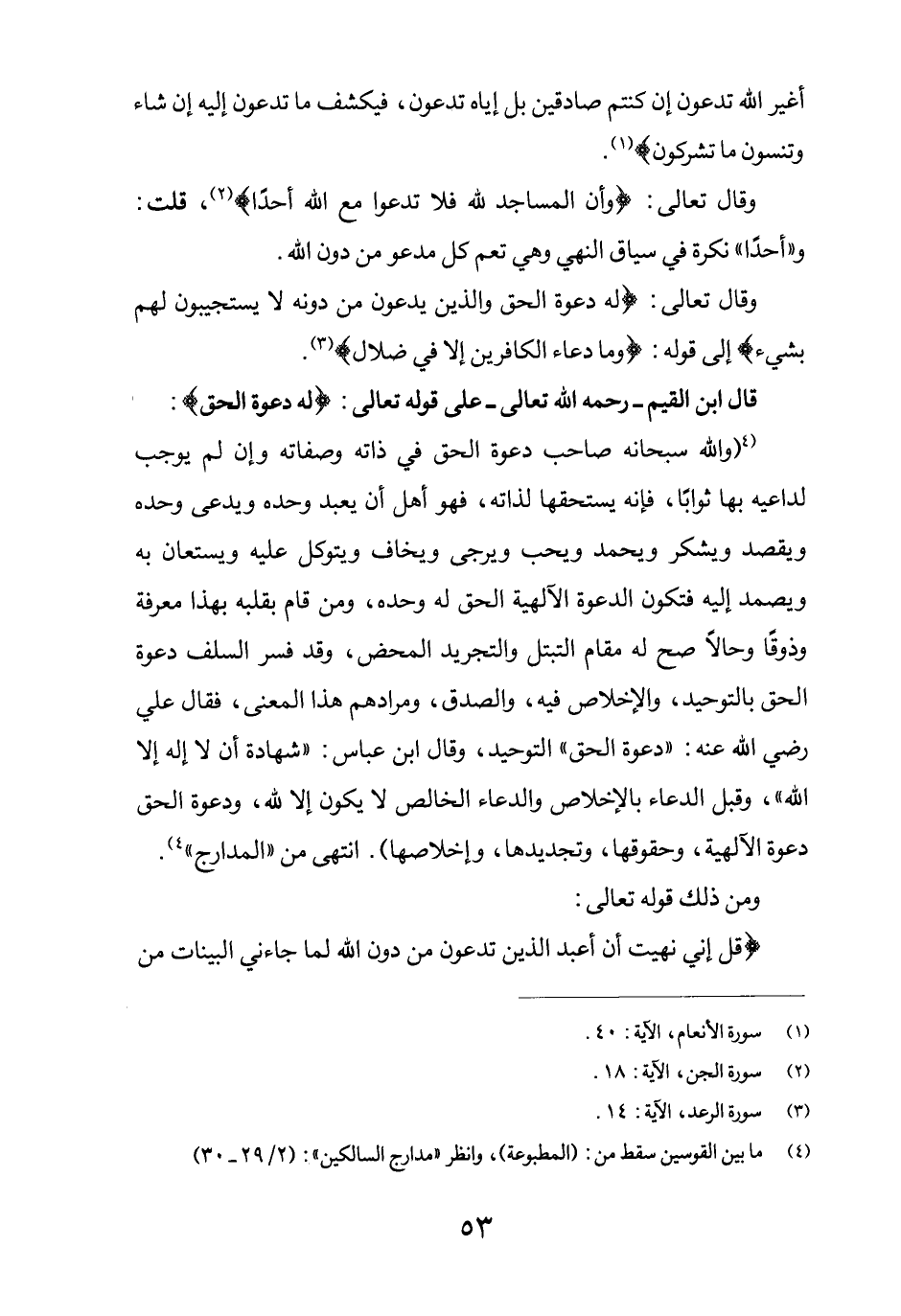 دعوة الآلهية، وحقوقها، وتجديدها، وإخلاصها) (4) . انتهى من "المدارج". ومن ذلك قوله تعالى:
