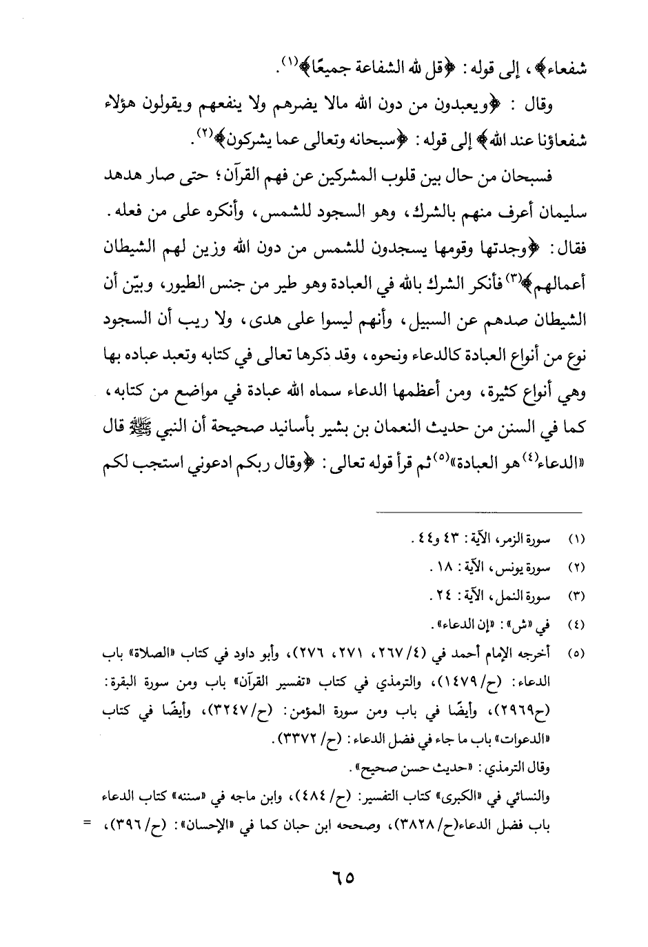 فقال: {وَجَدْتُهَا وَقَوْمَهَا يَسْجُدُونَ لِلشَّمْسِ مِنْ دُونِ اللَّهِ وَزَيَّنَ لَهُمُ الشَّيْطَانُ أَعْمَالَهُم} (3) فأنكر الشرك بالله في العبادة وهو طير من جنس الطيور، وبيّن أن الشيطان صدهم عن السبيل، وأنهم ليسوا على هدى، ولا ريب أن السجود نوع من أنواع العبادة كالدعاء ونحوه، وقد ذكرها تعالى في كتابه وتعبد عباده بها وهي أنواع كثيرة، ومن أعظمها الدعاء سماه الله عبادة في مواضع من كتابه، كما في السنن من حديث النعمان بن بشير بأسانيد صحيحة أن النبي صلى الله عليه وسلم قال "الدعاء (4) هو العبادة" ثم قرأ قوله تعالى: {وَقَالَ رَبُّكُمُ ادْعُونِي أَسْتَجِبْ لَكُمْ