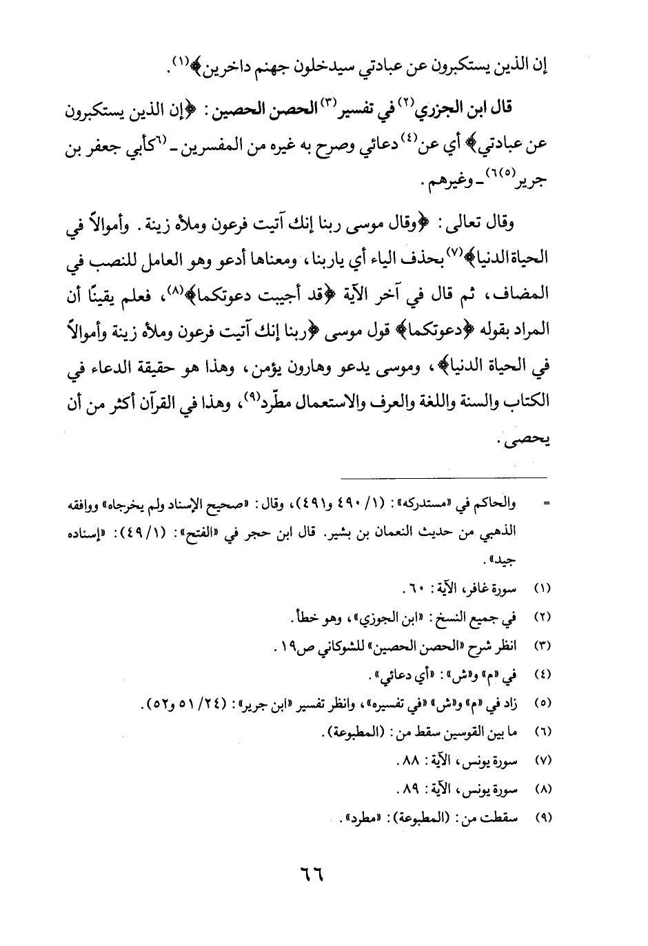 قال ابن الجزري (2) في تفسير (3) الحصن الحصين: {إِنَّ الَّذِينَ يَسْتَكْبِرُونَ عَنْ عِبَادَتِي} أي عن (4) دعائي وصرح به غيره من المفسرين – (6كأبي جعفر بن جرير6 (5)) (6) - وغيرهم.