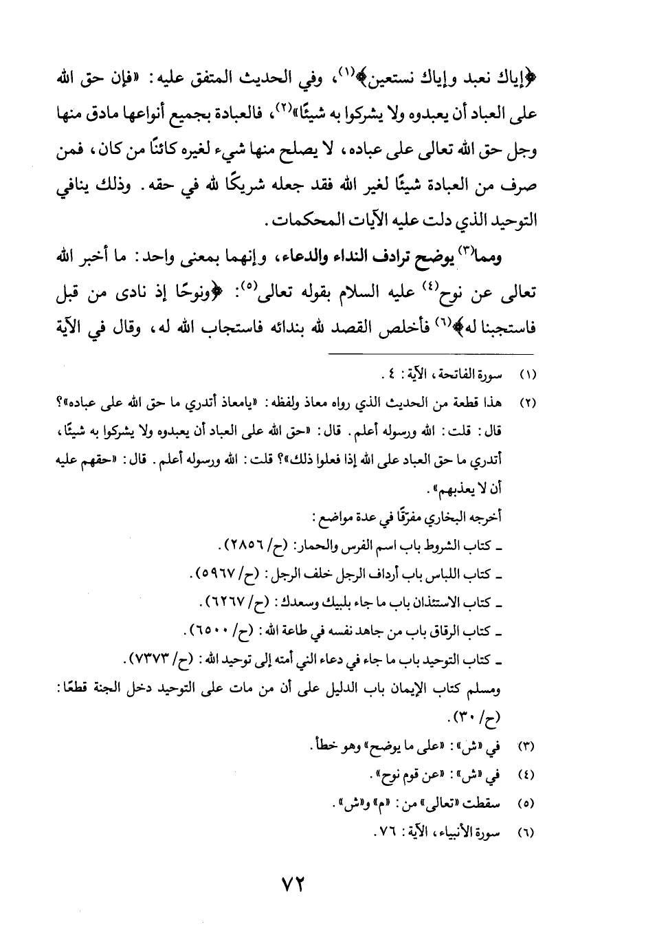 {إِيَّاكَ نَعْبُدُ وَإِيَّاكَ نَسْتَعِين} (1) ، وفي الحديث المتفق عليه: "فإن حق الله على العباد أن يعبدوه ولا يشركوا به شيئاً" (2) ، فالعبادة بجميع أنواعها مادق منها وجل حق الله تعالى على عبادهن لا يصلح منها شيء لغيره كائناً من كان، فمن صرف من العبادة شيئاً لغير الله فقد جعله شريكاً لله في حقه. وذلك ينافي التوحيد الذي دلت عليه الآيات المحكمات.