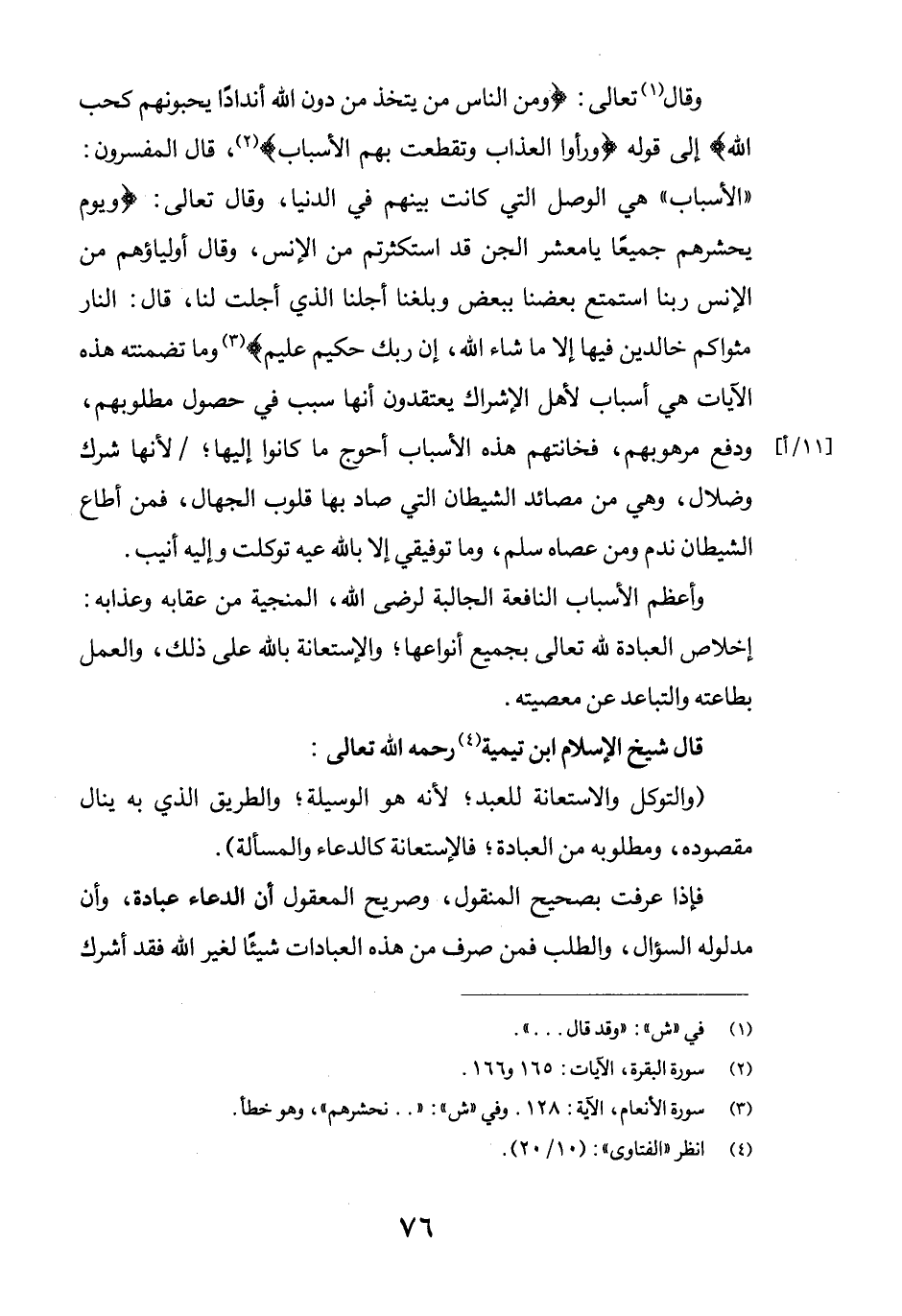 "الأسباب"هي الوصل التي كانت بينهم في الدنيا، وقال تعالى: {وَيَوْمَ يَحْشُرُهُمْ جَمِيعاً يَا مَعْشَرَ الْجِنِّ قَدِ اسْتَكْثَرْتُمْ مِنَ الْأِنْسِ وَقَالَ أَوْلِيَاؤُهُمْ مِنَ الْأِنْسِ رَبَّنَا اسْتَمْتَعَ بَعْضُنَا بِبَعْضٍ وَبَلَغْنَا أَجَلَنَا الَّذِي أَجَّلْتَ لَنَا قَالَ النَّارُ مَثْوَاكُمْ خَالِدِينَ فِيهَا إِلَّا مَا شَاءَ اللَّهُ إِنَّ رَبَّكَ حَكِيمٌ عَلِيم} (3) وما تضمنته هذه الآيات هي أسباب لأهل الإشراك يعتقدون أنها سبب في حصول مطلوبهم، ودفع مرهوبهم، فخانتهم هذه الأسباب أحوج ما كانوا إليها؛/لأنها شرك وضلال، وهي من مصائد الشيطان التي صاد بها قلوب الجهال، فمن أطاع الشيطان ندم ومن عصاه سلم، وما توفيقي إلا بالله عليه توكلت وإليه أنيب. وأعظم الأسباب النافعة الجالبة لرضى الله، المنجية من عقابه وعذابه: إخلاص العبادة لله تعالى بجميع أنواعها؛ والاستعانة على ذلك، والعمل بطاعته والتباعد عن معصيته. قال شيخ الإسلام ابن تيمية (4) رحمه الله تعالى: (والتوكل والاستعانة للعبد؛ لأنه هو الوسيلة؛ والطريق الذي به ينال مقصوده، ومطلوبه من العبادة؛ فالاستعانة كالدعاء والمسألة) .