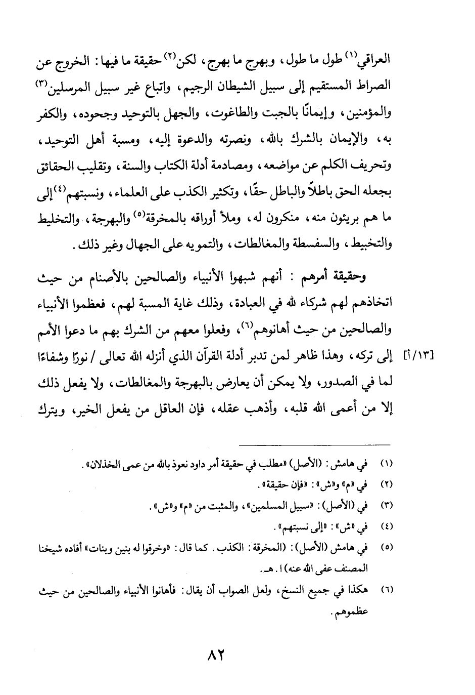 العراقي (1) طول ما طول، وبهرج ما بهرج، لكن (2) حقيقة ما فيها: الخروج عن الصراط المستقيم إلى سبيل الشيطان الرجيم، واتباع غير سبيل المرسلين (3) والمؤمنين، وإيماناً بالجبت والطاغوت، والجهل بالتوحيد وجحوده، والكفر به، والإيمان بالشرك بالله، ونصرته، والدعوة إليه، ومسبة أهل التوحيد، وتحريف الكلم عن مواضعه، ومصادمة أدلة الكتاب والسنة، وتقليب الحقائق بجعله الحق باطلاً والباطل حقاً، وتكثير الكذب على العلماء، ونسبتهم (4) إلى ما هم بريئون منه، منكرون له، وملأ أوراقه بالمخرقة (5) والبهرجة، والتخليط والتخبيط، والسفسطة والمغالطات، والتمويه على الجهال وغير ذلك. وحقيقة أمرهم: أنهم شبهوا الأنبياء والصالحين بالأصنام من حيث اتخاذهم لهم شركاء لله في العبادة، وذلك غاية المسبة لهم، فعظموا الأنبياء والصالحين من حيث أهانوهم (6) ، وفعلوا معهم من الشرك بهم ما دعوا الأمم إلى تركه، وهذا ظاهر لمن تدبر أدلة القرآن الذي أنزله الله تعالى/ نوراً وشفاءًا لما في الصدور، ولا يمكن أن يعارض بالبهرجة والمغالطات، ولا يفعل ذلك إلا من أعمى الله قلبه، وأذهب عقله، فإن العاقل من يفعل الخير، ويترك