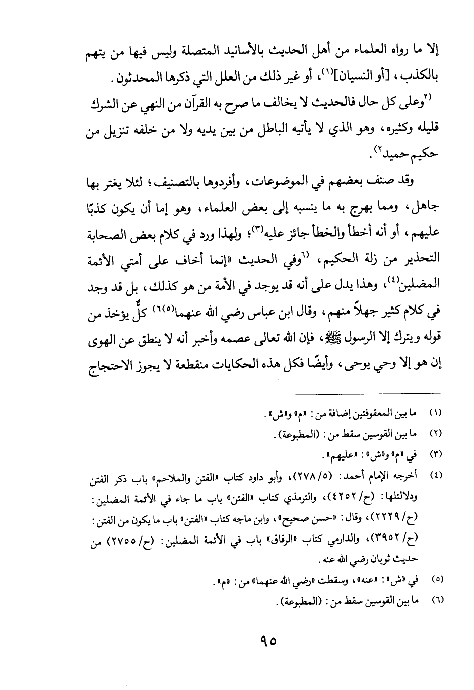 وقد صنف بعضهم في الموضوعات، وأفردها بالتصنيف؛ لئلا يغتر بها جاهل، ومما بهرج به ما ينسبه إلى بعض العلماء، وهو إما أن يكون كذباً عليهم، أو أنه أخطأ والخطأ جائز عليه (3) ؛ ولهذا ورد في كلام بعض الصحابة التحذير من زلة الحكيم، (6 وفي الحديث "إنما أخاف على أمتي الأئمة المضلين (4) ، وهذا يدل على أنه قد يوجد في الأمة من هو كذلك، بل قد وجد في كلام كثير جهلاً منهم، وقال ابن عباس رضي الله عنهما 6) (5) (6) كلٌّ يؤخذ من قوله ويترك إلا الرسول صلى الله عليه وسلمن فإن الله تعالى عصمه وأخبر أنه لا ينطق عن الهوى إن هو إلا وحي يوحى، وأيضاً فكل هذه الحكايات منقطعة لا يجوز الاحتجاج