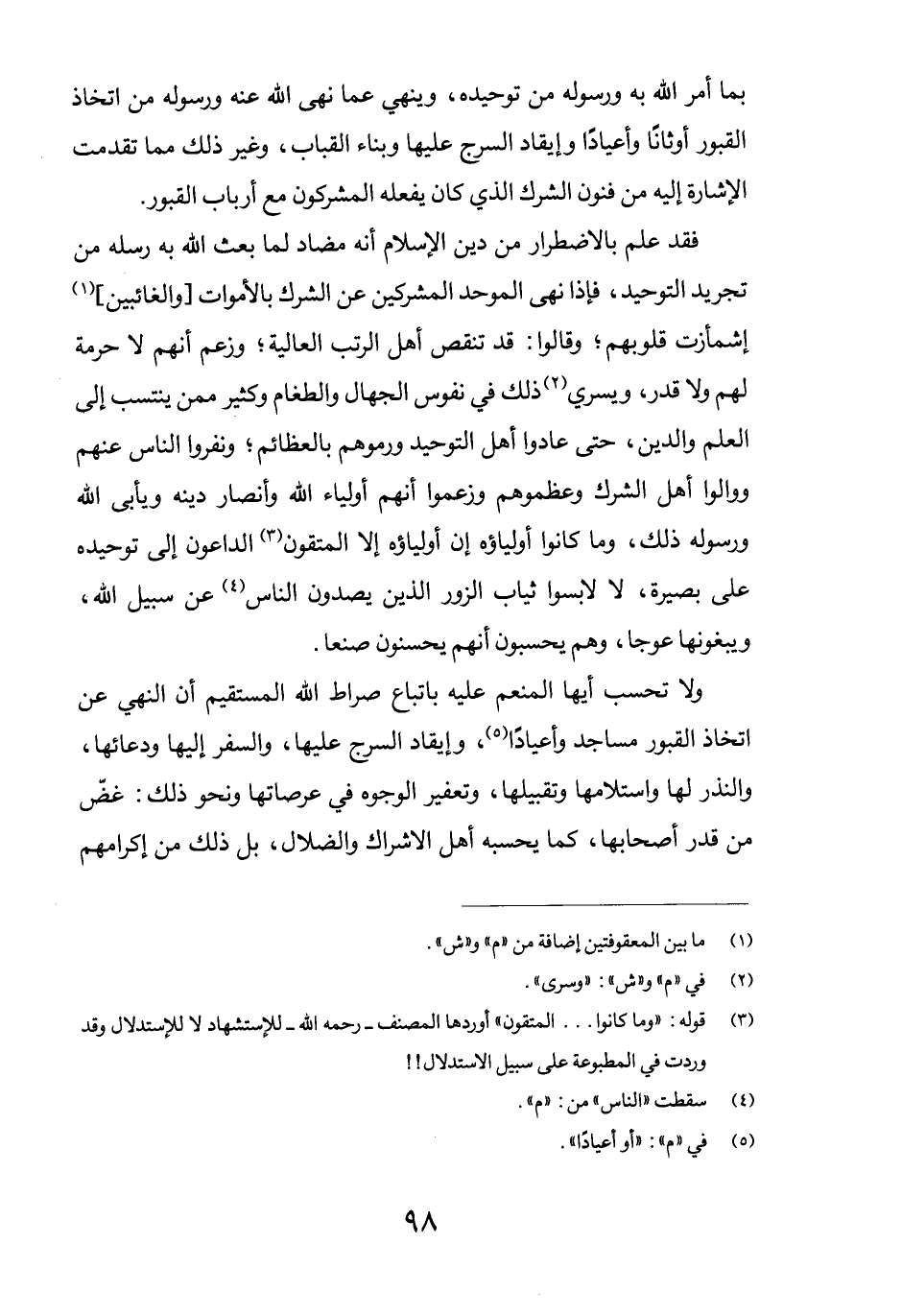 فقد علم بالاضطرار من دين الإسلام أنه مضاد لما بعث الله به رسله من تجريد التوحيد، فإذا نهى الموحد عن الشرك بالأموات [والغائبين] (1) إشمأزت قلوبهم؛ وقالوا: قد تنقص أهل الرتب العالية؛ وزعم أنهم لا حرمة لهم ولا قدر، ويسري (2) ذلك في نفوس الجهال والطغام وكثير ممن ينتسب إلى العلم والدين، حتى عادوا أهل التوحيد ورموهم بالعظائم؛ ونفروا الناس عنهم ووالوا أهل الشرك وعظموهم وزعموا أنهم أولياء الله وأنصار دينه ويأبى الله ورسوله ذلك، وما كانوا أولياؤه إن أولياؤه إلا المتقون (3) الداعون إلى توحيده على بصيرة، لا لابسوا ثياب الزور الذين يصدون الناس (4) عن سبيل الله، ويبغونها عوجا، وهم يحسبون أنهم يحسنون صنعا. ولا تحسب أيها المنعم عليه باتباع صراط المستقيم أن النهي عن اتخاذ القبور مساجد وأعياداً (5) ، وإيقاد السرج عليها، والسفر إليها ودعائها، والنذر لها واستلامها وتقبيلها، وتعفير الوجوه في عرصاتها ونحو ذلك: غضّمن قدر أصحابها، كما يحسبه أهل الإشراك والضلال، بل ذلك من إكرامهم