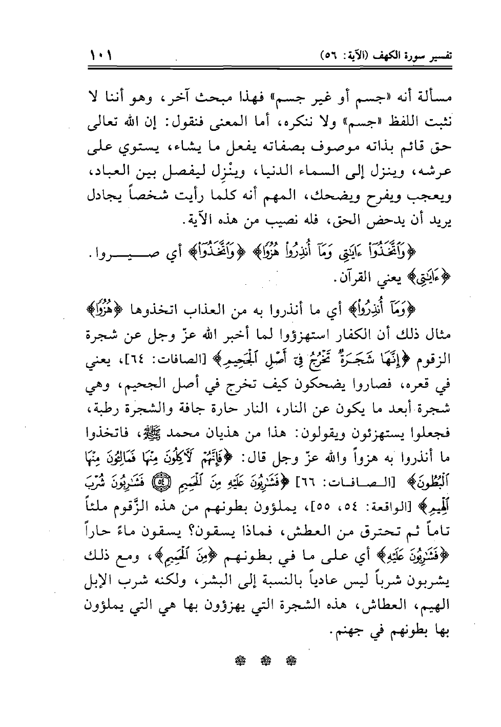 (وَمَا أُنْذِرُوا) أي ما أنذروا به من العذاب اتخذوها (هُزُواً) مثال ذلك أن الكفار استهزؤوا لما أخبر الله عز وجل عن شجرة الزقوم) إِنَّهَا شَجَرَةٌ تَخْرُجُ فِي أَصْلِ الْجَحِيمِ) (الصافات: ٦٤)، يعني في قعره، فصاروا يضحكون كيف تخرج في أصل الجحيم، وهي شجرة أبعد ما يكون عن النار، النار حارة جافة والشجرة رطبة، فجعلوا يستهزئون ويقولون: هذا من هذيان محمد صلى الله عليه وسلم، فاتخذوا ما أنذروا به هزواً والله عز وجل قال: (فَإِنَّهُمْ لَآكِلُونَ مِنْهَا فَمَالِئُونَ مِنْهَا الْبُطُونَ) (الصافات: ٦٦) فَشَارِبُونَ عَلَيْهِ مِنَ الْحَمِيمِ (٥٤) فَشَارِبُونَ شُرْبَ الْهِيمِ) (الواقعة: ٥٥)، يملؤون بطونهم من هذه الزَّقوم ملئاً تاماً ثم تحترق من العطش، فماذا يسقون؟ يسقون ماءً حاراً (فَشَارِبُونَ عَلَيْهِ) أي على ما في بطونهم (مِنَ الْحَمِيمِ)، ومع ذلك يشربون شرباً ليس عادياً بالنسبة إلى البشر، ولكنه شرب الإبل الهيم، العطاش، هذه الشجرة التي يهزؤون بها هي التي يملؤون بها بطونهم في جهنم.