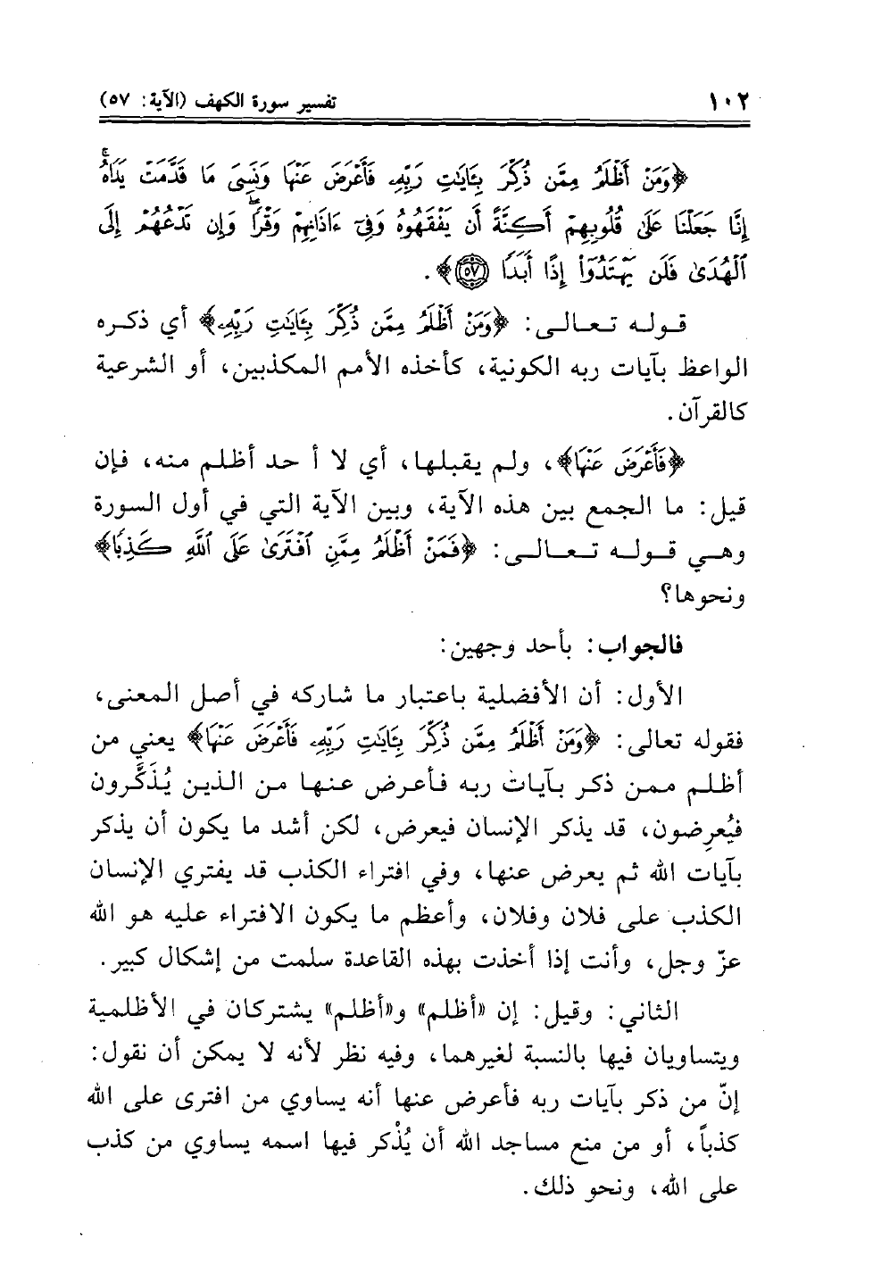 الأول: أن الأفضلية باعتبار ما شاركه في أصل المعنى، فقوله تعالى: (وَمَنْ أَظْلَمُ مِمَّنْ ذُكِّرَ بِآياتِ رَبِّهِ فَأَعْرَضَ عَنْهَا) يعني من أظلم ممن ذكر بآيات ربه فأعرض عنها من الذين يُذَكَّرون فيُعرِضون، قد يذكر الإنسان فيعرض، لكن أشد ما يكون أن يذكر بآيات الله ثم يعرض عنها، وفي افتراء الكذب قد يفتري الإنسان الكذب على فلان وفلان، وأعظم ما يكون الافتراء عليه هو الله، وأنت إذا أخذت بهذه القاعدة سلمت من إشكال كبير.
