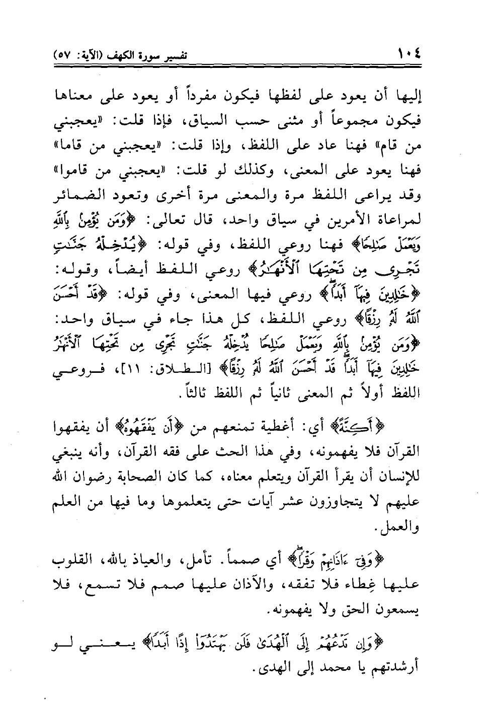 إليها أن يعود على لفظها فيكون مفرداً أو يعود على معناها فيكون مجموعاً أو مثنى حسب السياق، فإذا قلت: "يعجبني من قام" فهنا عاد على اللفظ، وإذا قلت: "يعجبني من قاما" فهنا يعود على المعنى، وكذلك لو قلت: "يعجبني من قاموا" وقد يراعى اللفظ مرة والمعنى مرة أخرى وتعود الضمائر لمراعاة الأمرين في سياق واحد، قال تعالى: (ومن يؤمن بالله وعمل صالحا) فهنا روعي اللفظ، وفي قوله: (يدخله جنات تجرى من تحتها الانهار) روعي اللفظ أيضاً، وقوله: (خالدين فيها أبدا) روعي فيها المعنى، وفي قوله: (قد أحسن الله له رزقا) روعي اللفظ، كل هذا جاء في سياق واحد: (وَمَنْ يُؤْمِنْ بِاللَّهِ وَيَعْمَلْ صَالِحاً يُدْخِلْهُ جَنَّاتٍ تَجْرِي مِنْ تَحْتِهَا الْأَنْهَارُ خَالِدِينَ فِيهَا أَبَداً قَدْ أَحْسَنَ اللَّهُ لَهُ رِزْقاً) (الطلاق: الآية ١١)، فروعي اللفظ أولاً ثم المعنى ثانياً ثم اللفظ ثالثاً.