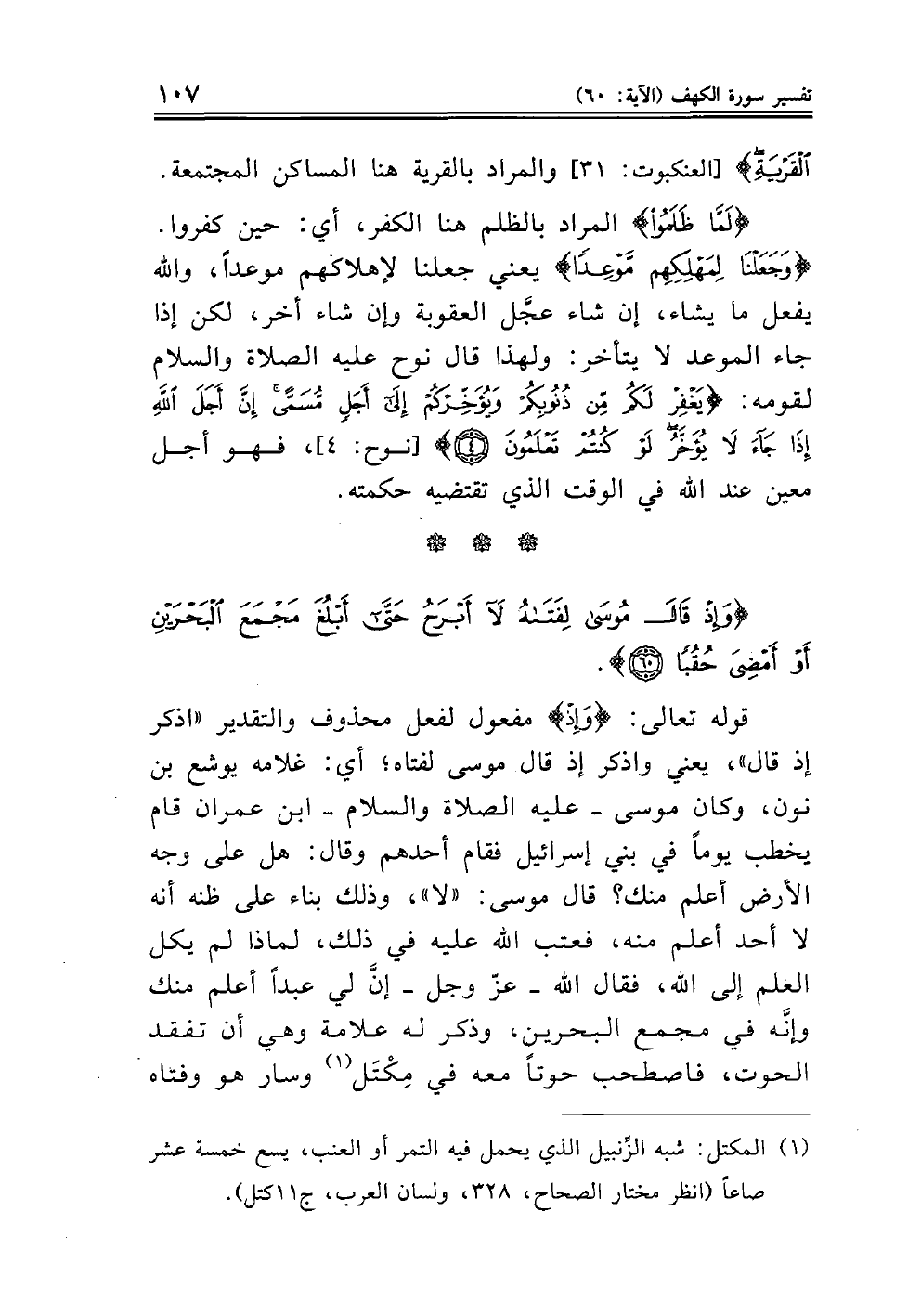قوله تعالى: (وَإِذْ) مفعول لفعل محذوف والتقدير "اذكر إذ قال"، يعني واذكر إذ قال موسى لفتاه؛ أي: غلامه يوشع بن نون، وكان موسى - عليه الصلاة والسلام - ابن عمران قام يخطب يوماً في بني إسرائيل فقام أحدهم وقال: هل على وجه الأرض أعلم منك؟ قال موسى: "لا"، وذلك بناء على ظنه أنه لا أحد أعلم منه، فعتب الله عليه في ذلك، لماذا لم يكل العلم إلى الله، فقال الله عز وجل إنَّ لي عبداً أعلم منك وإنَّه في مجمع البحرين، وذكر له علامة وهي أن تفقد الحوت، فاصطحب حوتاً معه في مِكْتَل (¬١) وسار هو وفتاه