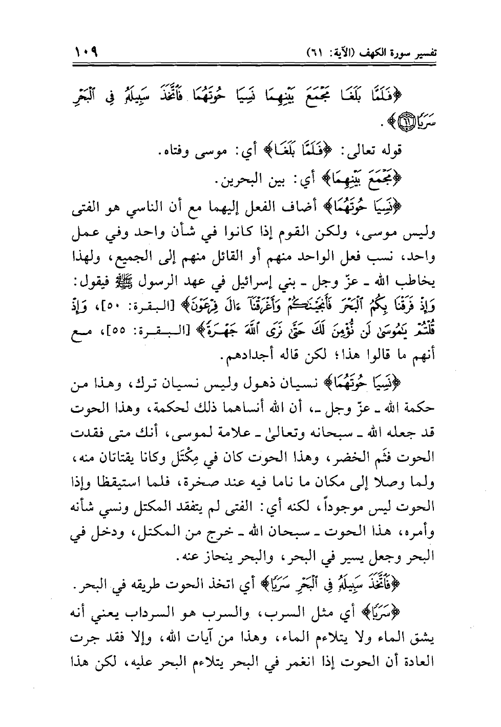(نَسِيَا حُوتَهُمَا) أضاف الفعل إليهما مع أن الناسي هو الفتى وليس موسى، ولكن القوم إذا كانوا في شأن واحد وفي عمل واحد، نسب فعل الواحد منهم أو القائل منهم إلى الجميع، ولهذا يخاطب الله عز وجل بني إسرائيل في عهد الرسول صلى الله عليه وسلم فيقول:)) وَإِذْ فَرَقْنَا بِكُمُ الْبَحْرَ فَأَنْجَيْنَاكُمْ وَأَغْرَقْنَا آلَ فِرْعَوْنَ وَأَنْتُمْ تَنْظُرُونَ) (البقرة: ٥٠)) وَإِذْ قُلْتُمْ يَا مُوسَى لَنْ نُؤْمِنَ لَكَ حَتَّى نَرَى اللَّهَ جَهْرَة) (البقرة: الآية ٥٥)، مع أنهم ما قالوا هذا؛ لكن قاله أجدادهم.