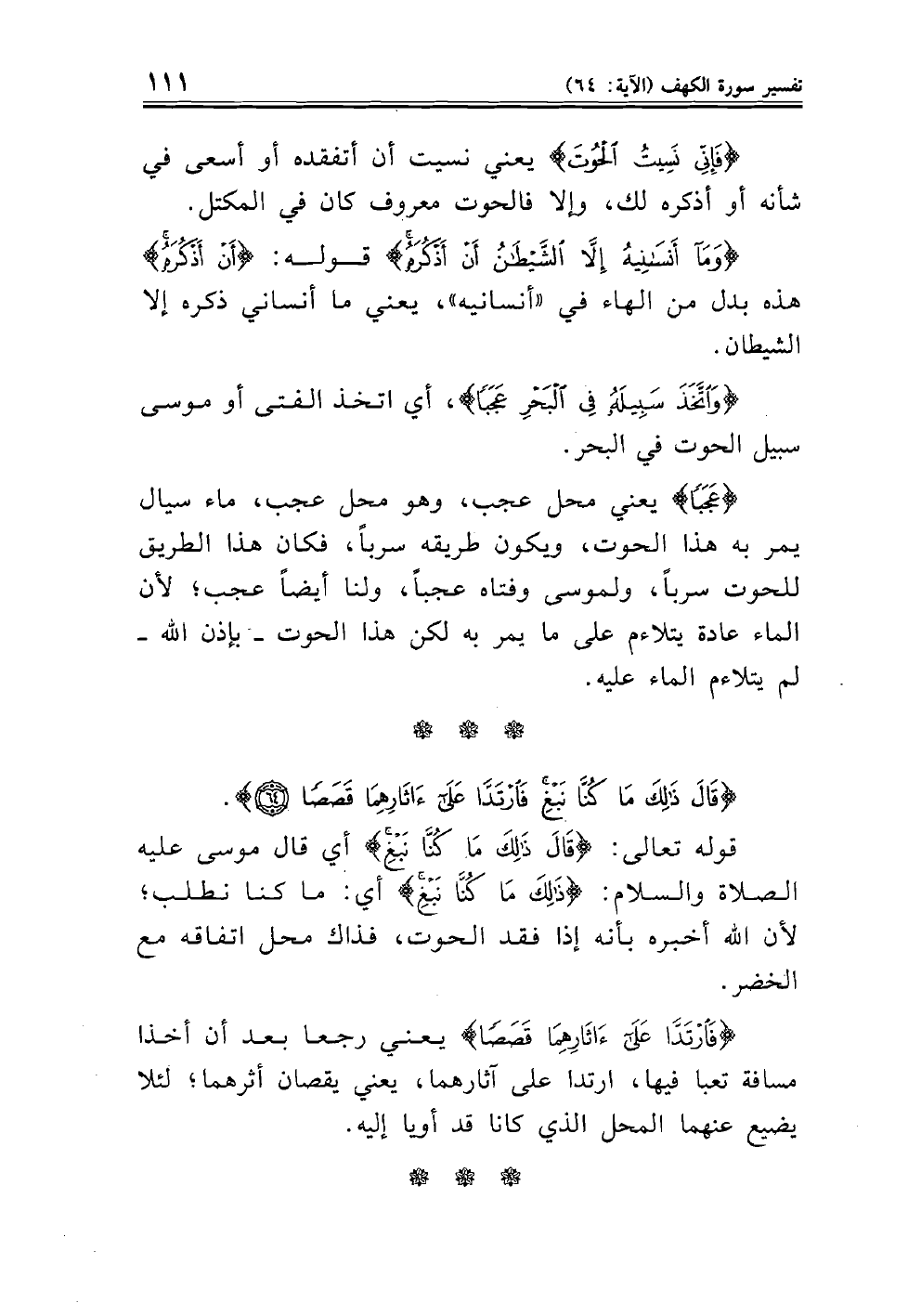 (فَإِنِّي نَسِيتُ الْحُوتَ) يعني نسيت أن أتفقده أو أسعى في شأنه أو أذكره لك، وإلا فالحوت معروف كان في المكتل.